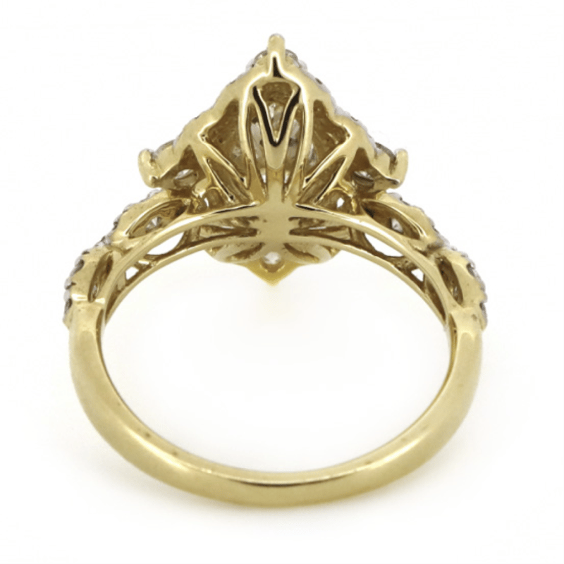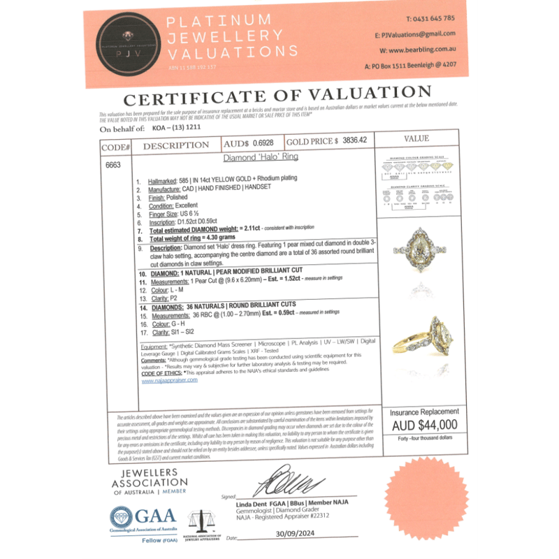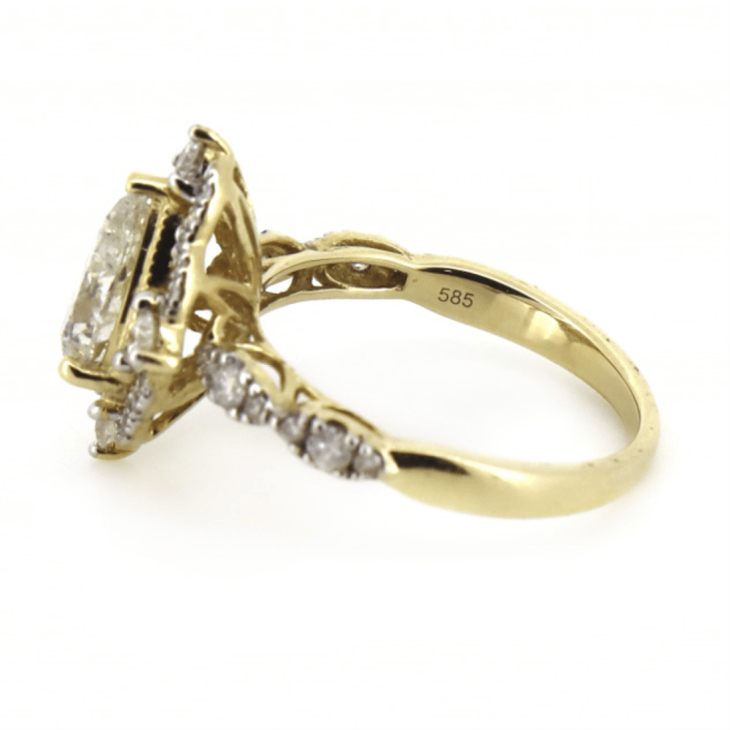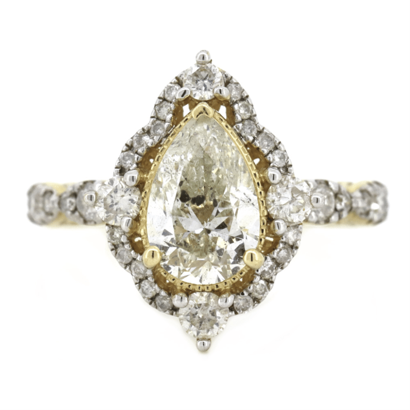 14K YELLOW GOLD AND DIAMOND, HALO RING. THE CENTRE FEATURES, ONE PEAR CUT, DIAMOND (1.52CT, L-M COLOUR, P2 CLARITY), 3 CLAW HALO SET. ENCOMPASSING THE CENTRE DIAMOND ARE, 36 ROUND BRILLIANT CUT, DIAMONDS (0.59CT TDW, G-H COLOUR, SI1-SI2 CLARITY), CLAW SET. RING SIZE M 1/2.