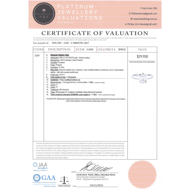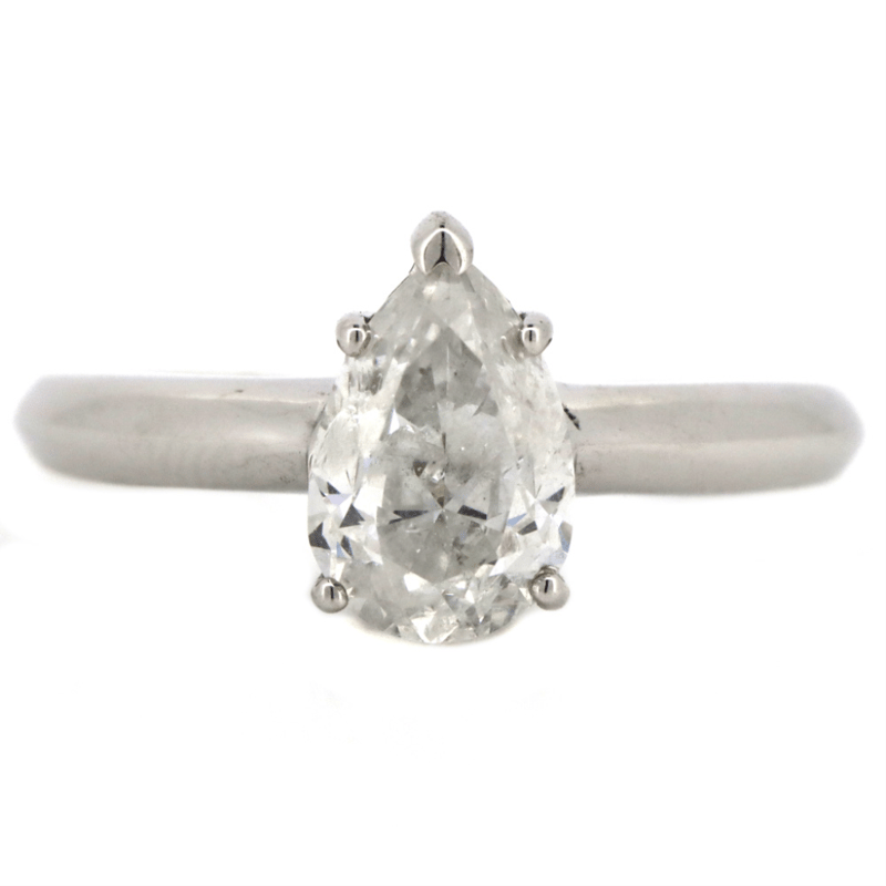 14K WHITE GOLD, 1.50CT DIAMOND, SOLITAIRE RING. THE CENTRE FEATURES, ONE PEAR BRILLIANT CUT, DIAMOND (1.50CT, G COLOUR, P1 CLARITY), CLAW SET. RING SIZE M 1/2.