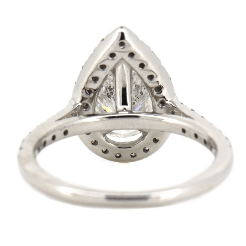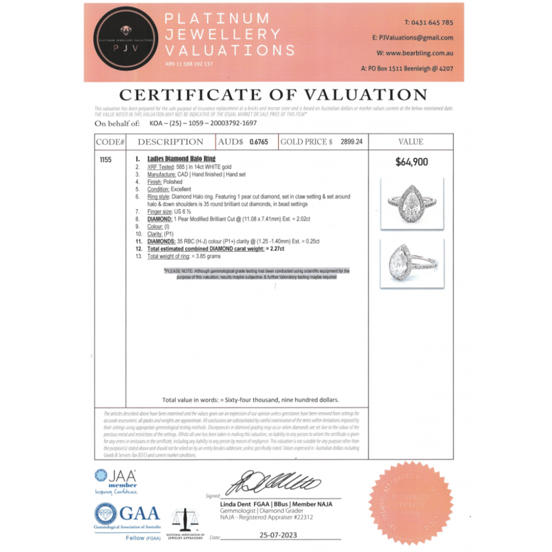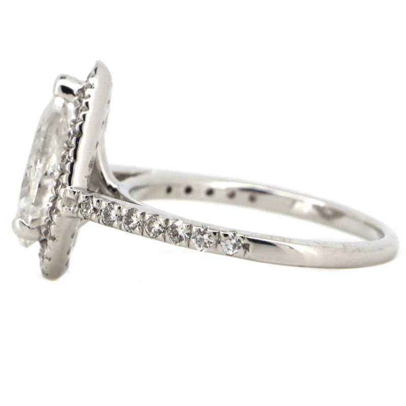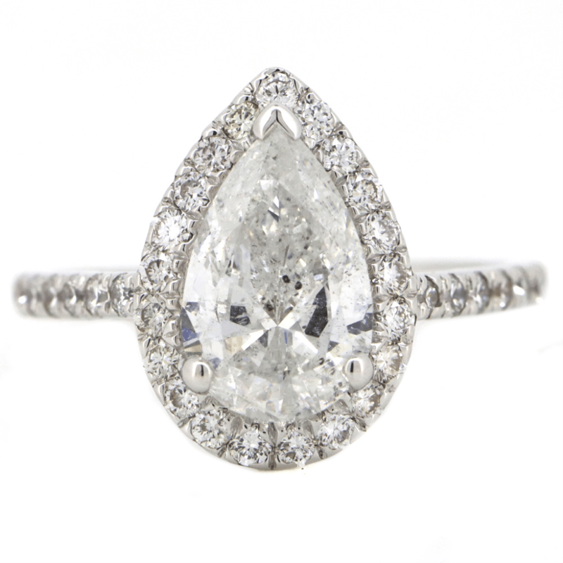 14K WHITE GOLD AND DIAMOND, HALO RING. THE CENTRE FEATURES, ONE PEAR MODIFIED BRILLIANT CUT, DIAMOND (2.02CT, I COLOUR, P1 CLARITY), 3 CLAW SET. SURROUNDING THE CENTRE IN A HALO AND DECORATING THE BAND ARE, 35 ROUND BRILLIANT CUT, DIAMONDS (0.25CT TDW, H-J COLOUR, P1+ CLARITY), BEAD SET. RING SIZE M.