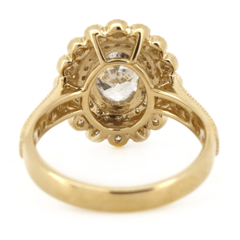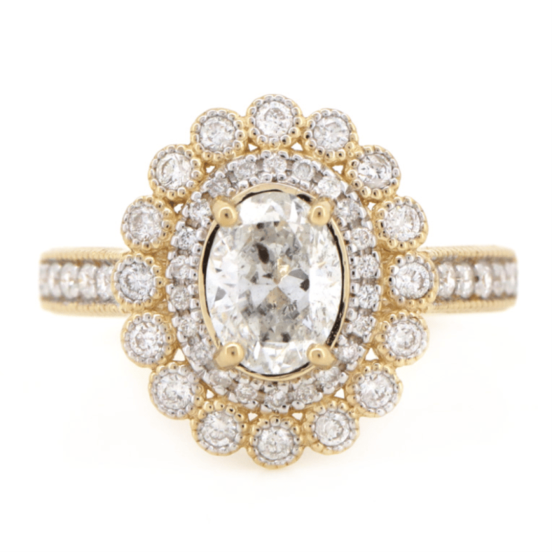 14K YELLOW GOLD AND DIAMOND, ANTIQUE INSPIRED HALO RING. THE CENTRE FEATURES, CUT DIAMOND (1.01CT, H COLOUR, I1 CLARITY), 4 CLAW SET. SURROUNDING THE CENTRE IN A DOUBLE HALO AND DECORATING THE BAND ARE, 50 ROUND BRILLIANT CUT, DIAMONDS (0.46CT TDW, G-H COLOUR, SI-I2 CLARITY), BEZEL/BEAD SET WITH MILLEGRAIN DETAIL. RING SIZE M.