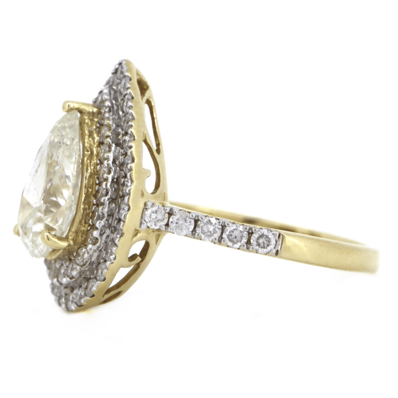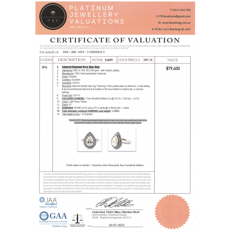 14K YELLOW GOLD, FANCY YELLOW DIAMOND, DOUBLE HALO RING. THE CENTRE FEATURES, ONE PEAR MODIFIED BRILLIANT CUT, LIGHT FANCY YELLOW, DIAMOND (2.21CT, P1 CLARITY), CLAW SET. SURROUNDING THE CENTRE IN A DOUBLE HALO AND DECORATING THE BAND ARE, 58 ROUND BRILLIANT CUT, DIAMONDS (0.66CT TDW, H-K COLOUR, P1+ CLARITY), BEAD SET. THE RING HAS BEEN 14K WHITE GOLD RHODIUM PLATED, TO ACHIEVE A TWO-TONE EFFECT. RING SIZE N.