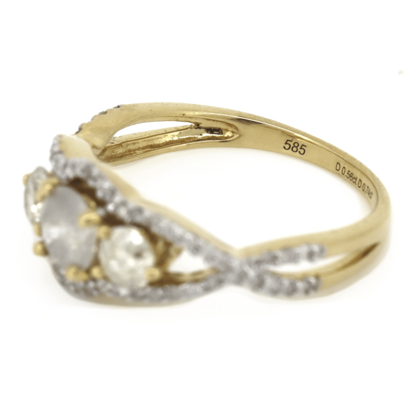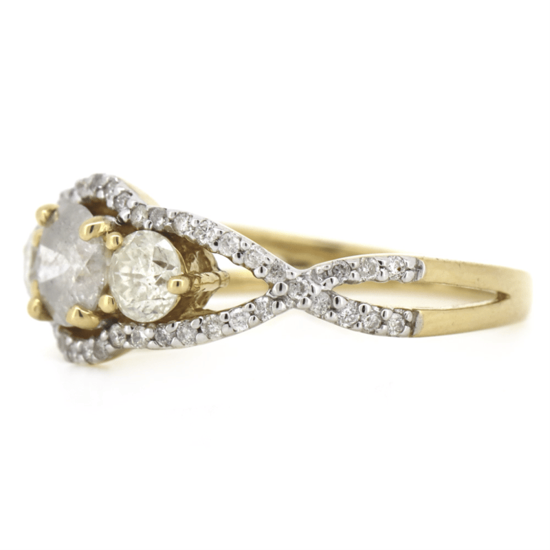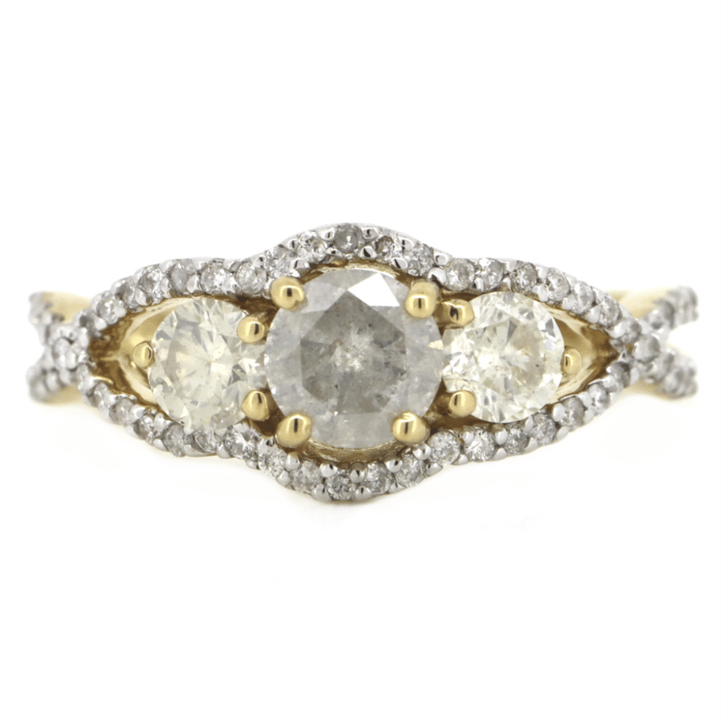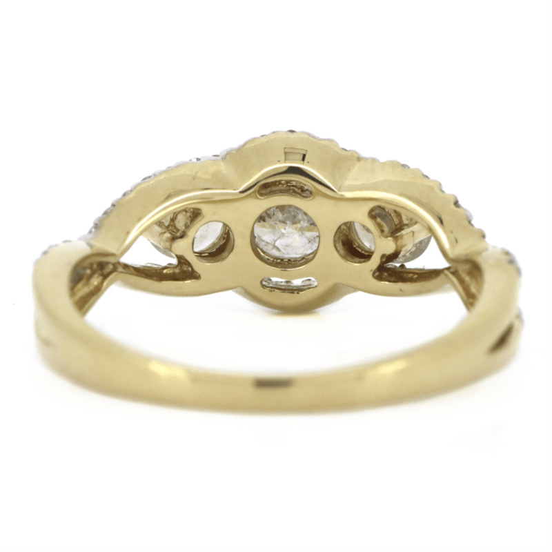 14K YELLOW GOLD AND DIAMOND, TRILOGY RING. THE CENTRE FEATURES, ONE ROUND BRILLIANT CUT, DIAMOND (0.56CT, H COLOUR, SALT & PEPPER CLARITY), 4 CLAW SET. ACCOMPANYING THE DESIGN ARE, 2 ROUND BRILLIANT CUT, DIAMONDS (0.50CT TDW, I-J COLOUR, SI2-P1 CLARITY), 3 CLAW SET. ENCOMPASSING THE DESIGN ARE, 54 ROUND BRILLIANT CUT, DIAMONDS (0.24CT TDW, G-J COLOUR, SI-P1 CLARITY), MICRO-BEAD SET. RING SIZE N 1/2.