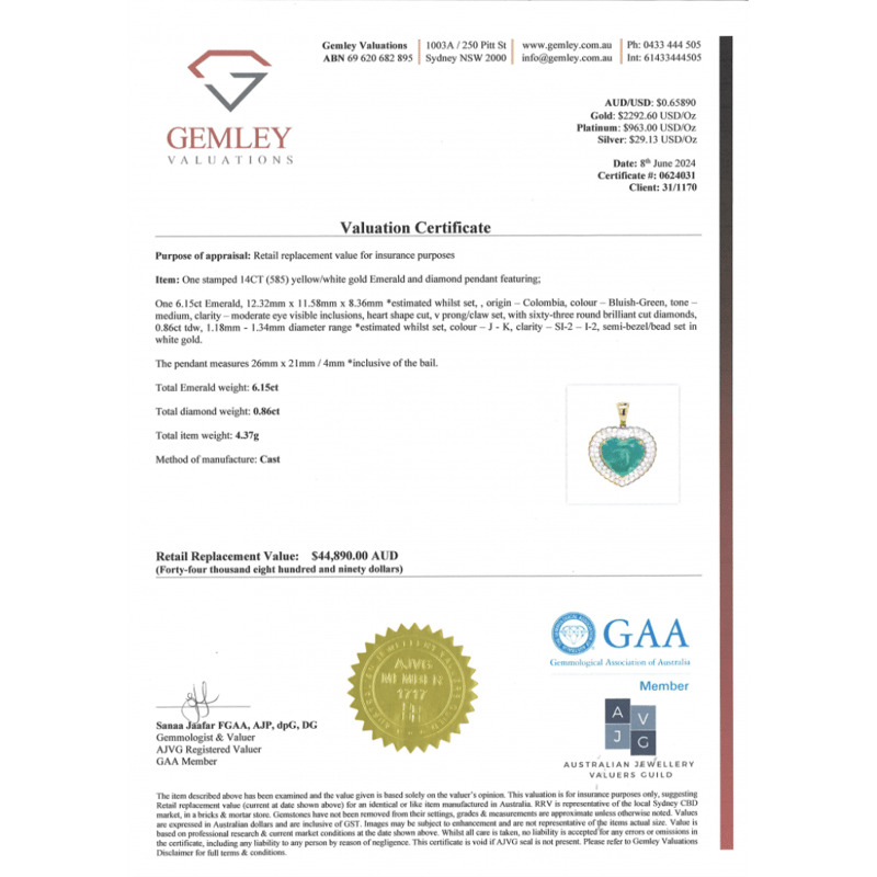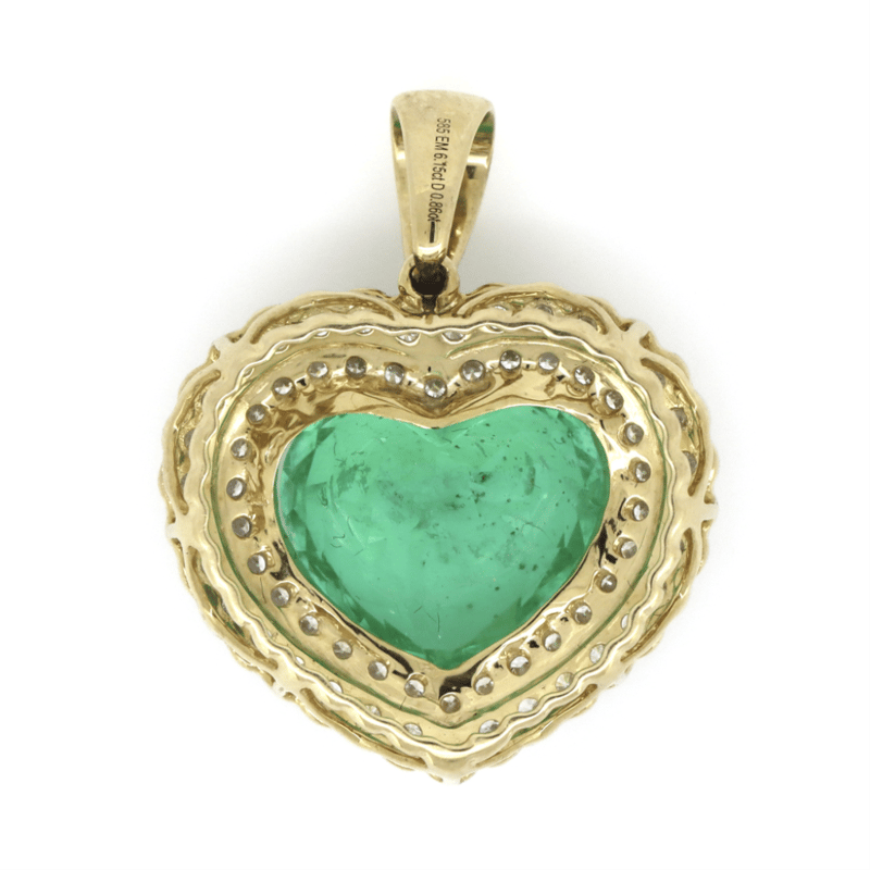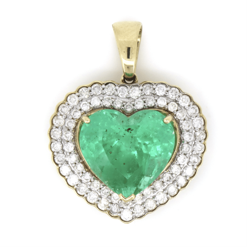 14K YELLOW GOLD, 6.15CT COLOMBIAN EMERALD AND DIAMOND, DOUBLE HALO STATEMENT PENDANT. THE CENTRE FEATURES, ONE HEART SHAPE CUT, MEDIUM BLUISH-GREEN, COLOMBIAN EMERALD (6.15CT, MODERATE EYE VISIBLE INCLUSIONS), V PRONG/CLAW SET. SURROUNDING THE CENTRE IN A DOUBLE HALO ARE, 63 ROUND BRILLIANT CUT, DIAMONDS (0.86CT TDW, J-K COLOUR, SI2-I2 CLARITY), SET IN WHITE GOLD, SEMI BEZEL, BEAD SET. CONDITION: NEW.
