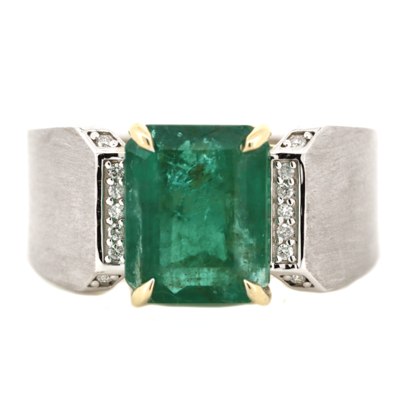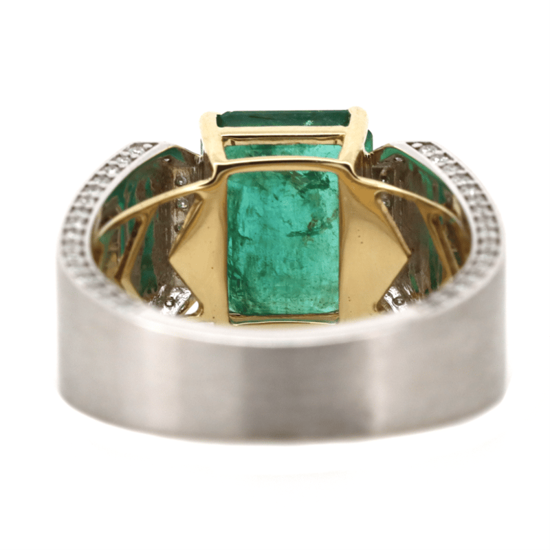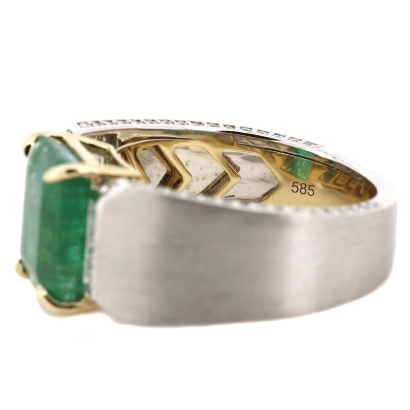 14K YELLOW/WHITE GOLD, EMERALD AND DIAMOND, DRESS RING. THE CENTRE FEATURES, ONE EMERALD CUT, EMERALD (3.41CT, MODERATE-HEAVY INCLUSIONS), CLAW SET. ENCOMPASSING THE CENTRE AND DECORATING THE BAND ARE, 78 ROUND BRILLIANT CUT, DIAMONDS (0.29CT TDW, G-K COLOUR, SI-I2 CLARITY), BEAD SET. RING SIZE M.