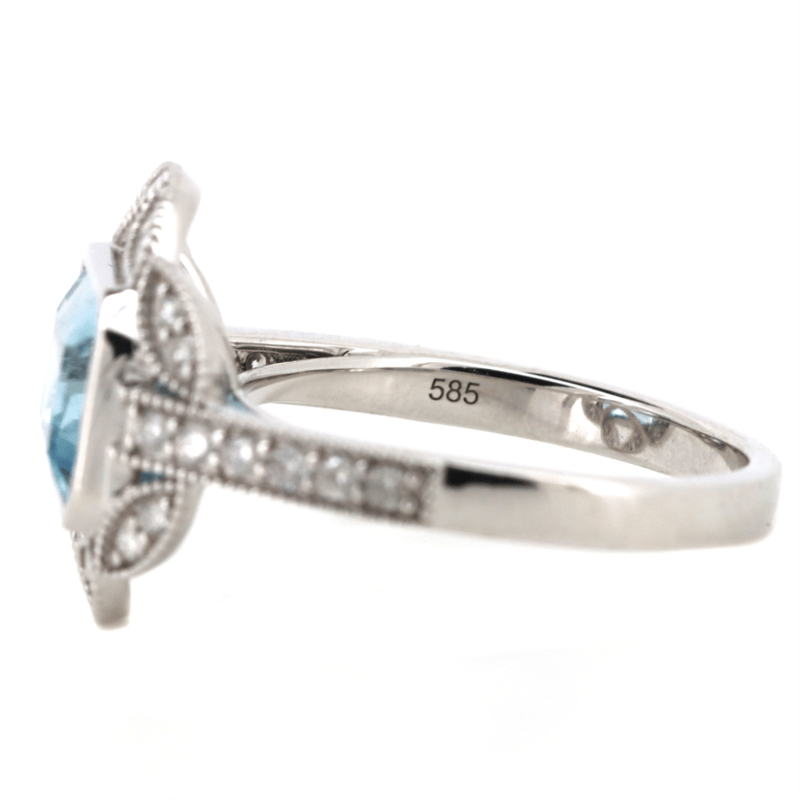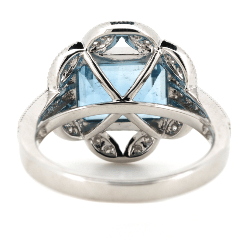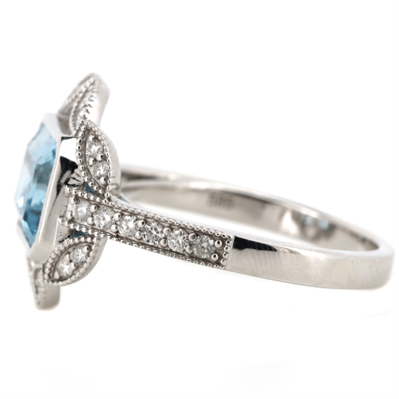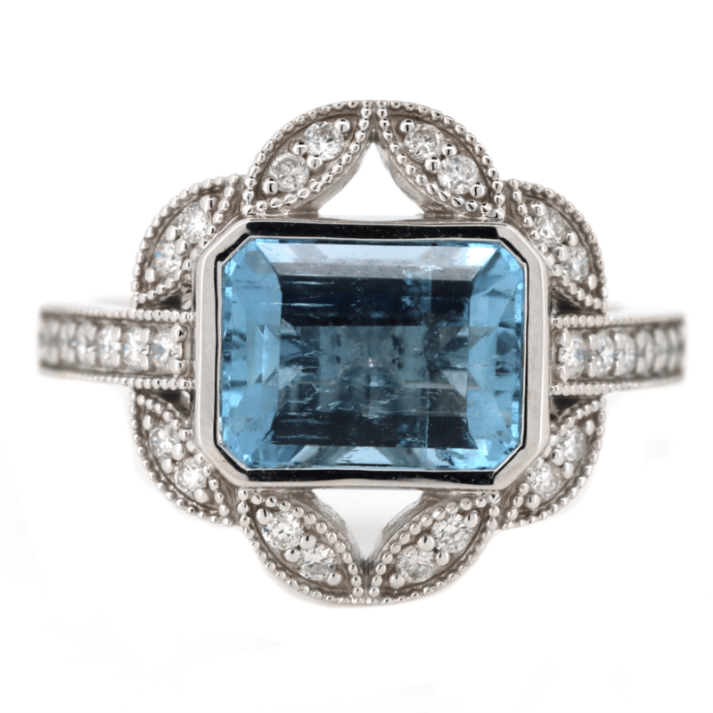 14K WHITE GOLD, AQUAMARINE AND DIAMOND, ANTIQUE INSPIRED RING. THE CENTRE FEATURES, ONE EMERALD CUT, AQUAMARINE (3.23CT, LIGHT MODERATE INCLUSIONS), BEZEL SET. EMBELLISHING THE DESIGN ARE, 28 ROUND BRILLIANT CUT, DIAMONDS (0.33CT TDW, G-J COLOUR, SI-I2 CLARITY), BEAD SET. RING SIZE N.