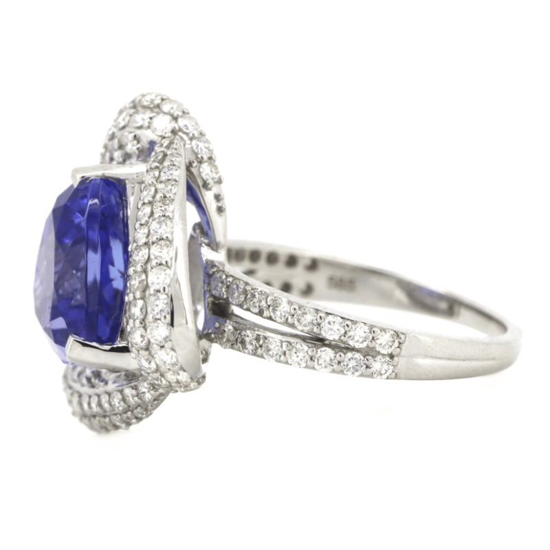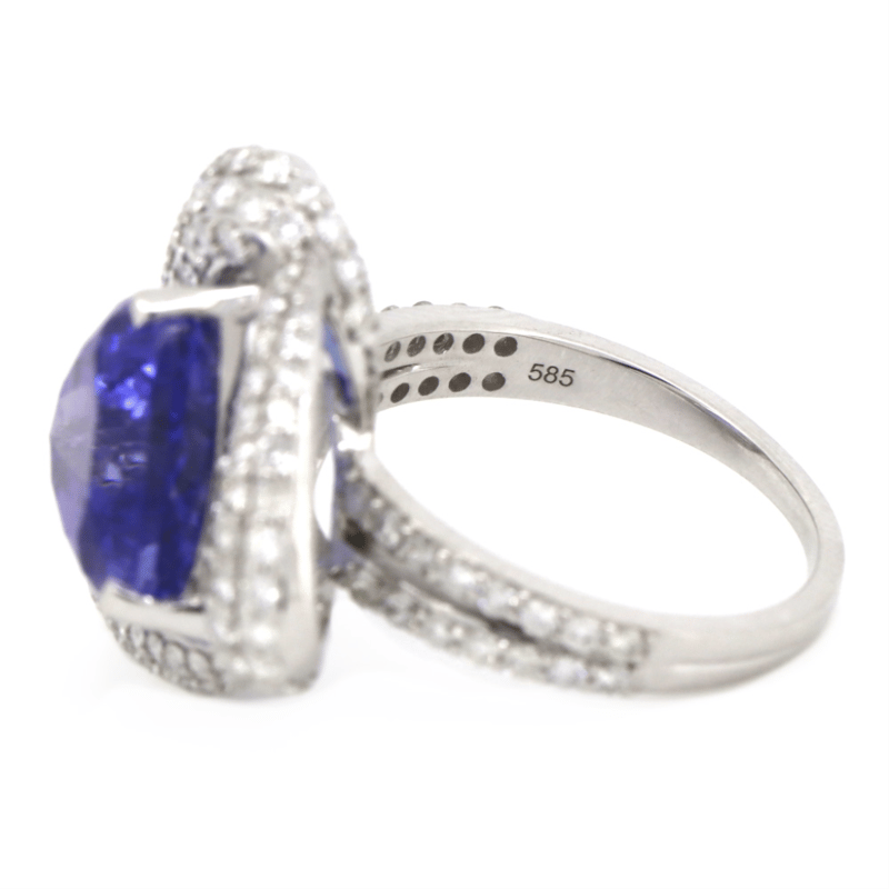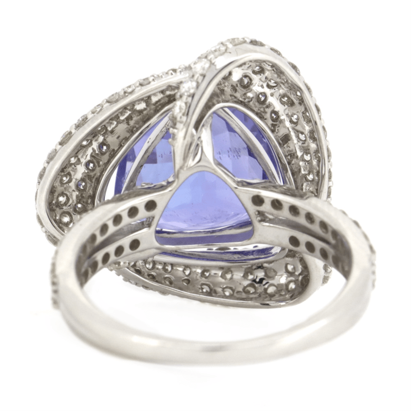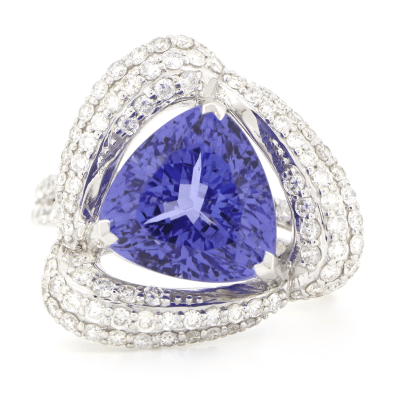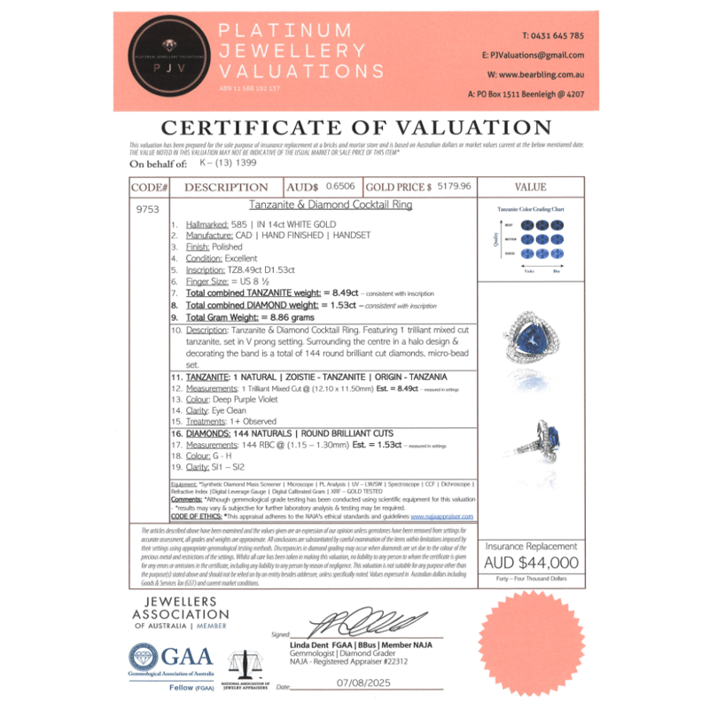14K WHITE GOLD, 8.49CT TANZANITE AND DIAMOND, COCKTAIL RING. THE CENTRE FEATURES, ONE TRILLIANT MIXED CUT, DEEP PURPLE VIOLET, TANZANITE (8.49CT, EYE CLEAN CLARITY), V PRONG SET. SURROUNDING THE CENTRE IN A HALO AND DECORATING THE BAND ARE, 144 ROUND BRILLIANT CUT, DIAMONDS (1.53CT TDW, G-H COLOUR, SI1-SI2 CLARITY), MICRO-BEAD SET IN WHITE GOLD. RING SIZE Q 1/2.