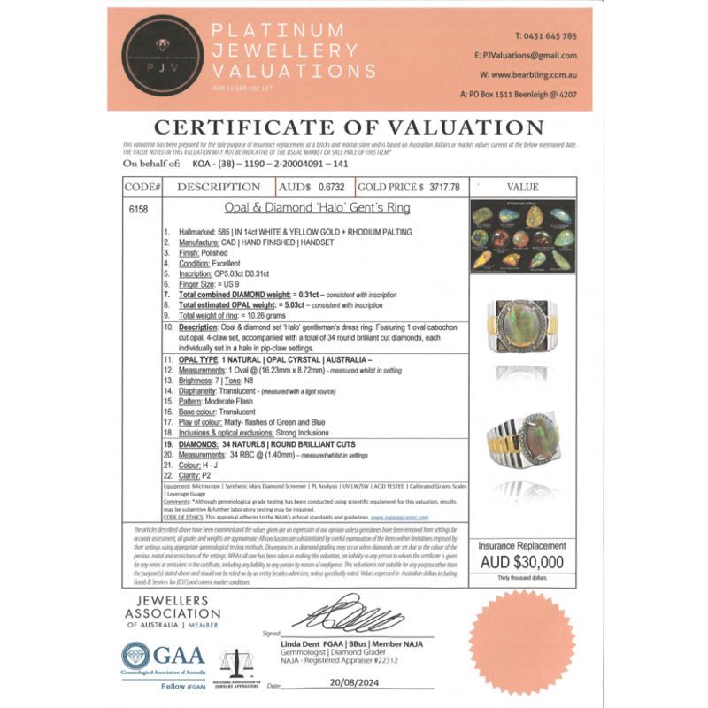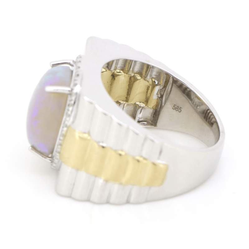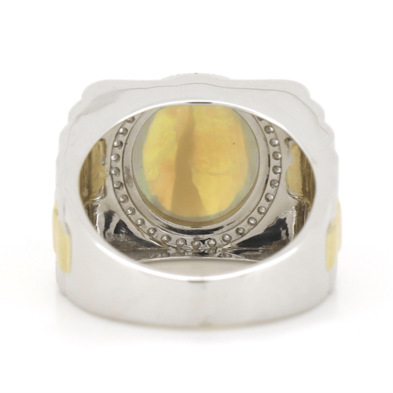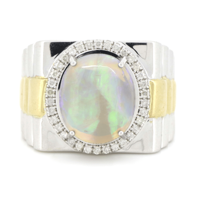 14K WHITE/YELLOW GOLD, 5.03CT AUSTRALIAN OPAL AND DIAMOND, GENTS RING. THE CENTRE FEATURES, ONE OVAL CABOCHON CUT, FLASHES OF GREEN AND BLUE, AUSTRALIAN OPAL (5.03CT), CLAW SET. SURROUNDING THE CENTRE IN A HALO ARE, 34 ROUND BRILLIANT CUT, DIAMONDS (0.31CT TDW, H-J COLOUR, P2 CLARITY), MICRO-CLAW SET. RING SIZE R 1/2.