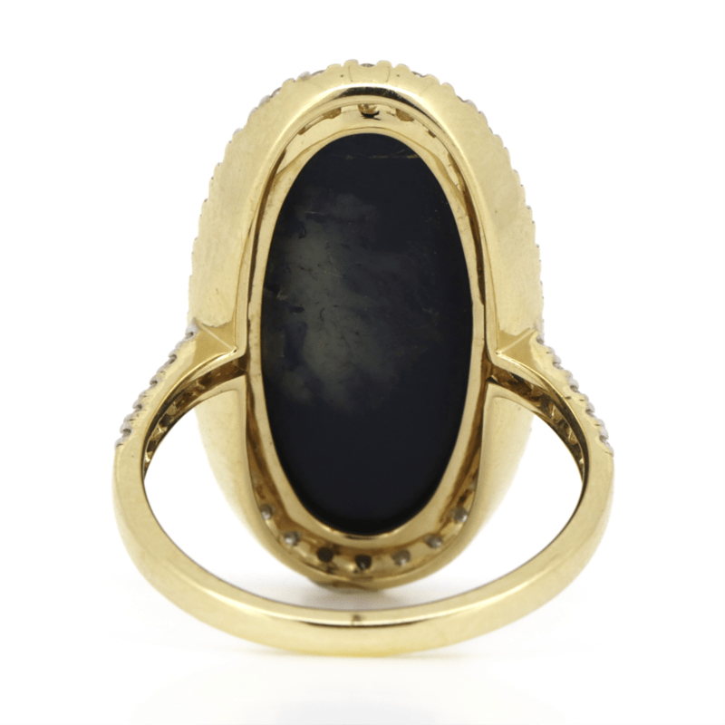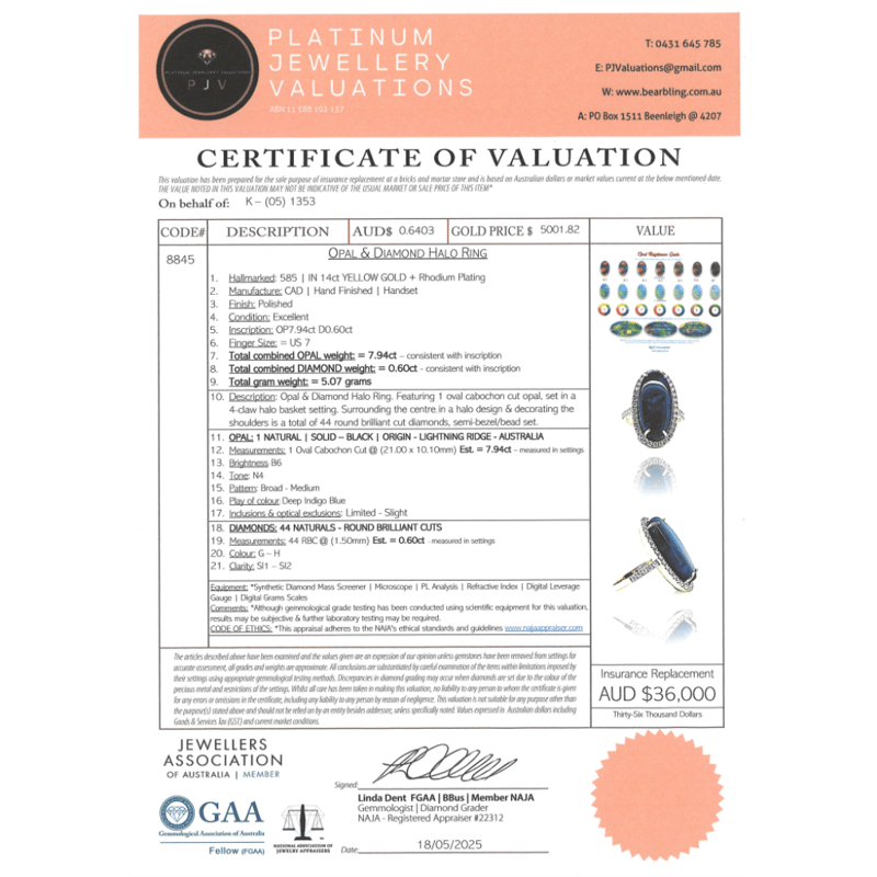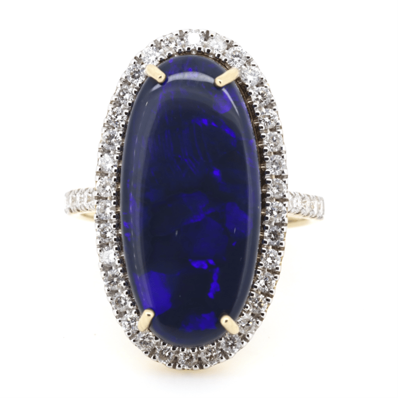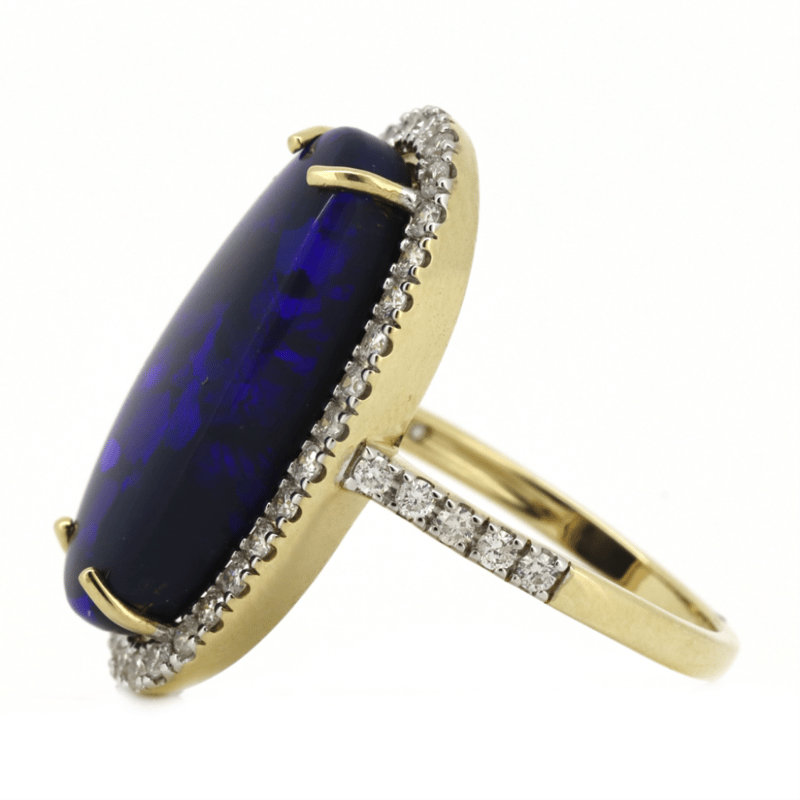 14K WHITE GOLD, 7.94CT AUSTRALIAN LIGHTNING RIDGE OPAL AND DIAMOND, HALO RING. THE CENTRE FEATURES, ONE OVAL CABOCHON CUT, AUSTRALIAN LIGHTNING RIDGE OPAL (7.94CT, DEEP INDIGO BLUE COLOUR PLAY, LIMITED-SLIGHT INCLUSIONS), CLAW SET. SURROUNDING THE CENTRE IN A HALO AND DECORATING SHOULDERS ARE, 44 ROUND BRILLIANT CUT, DIAMONDS (0.60CT TDW, G-H COLOUR, SI1-SI2 CLARITY), SEMI-BEZEL/BEAD SET IN YELLOW GOLD. RING SIZE N 1/2. CONDITION: NEW.