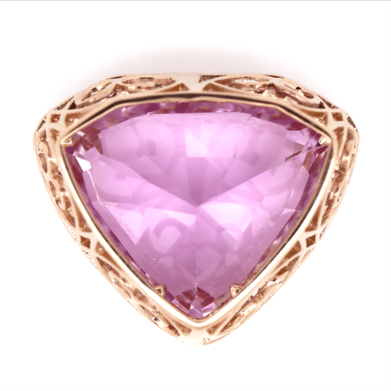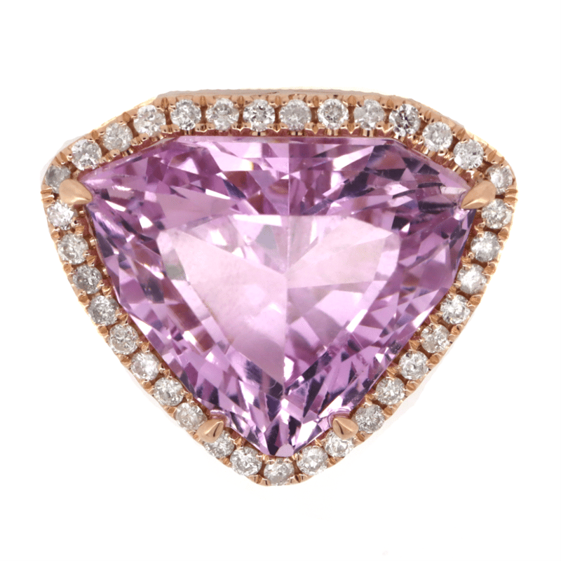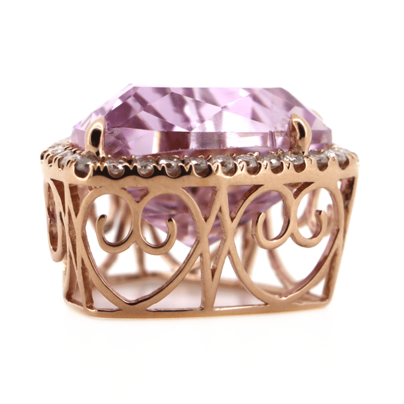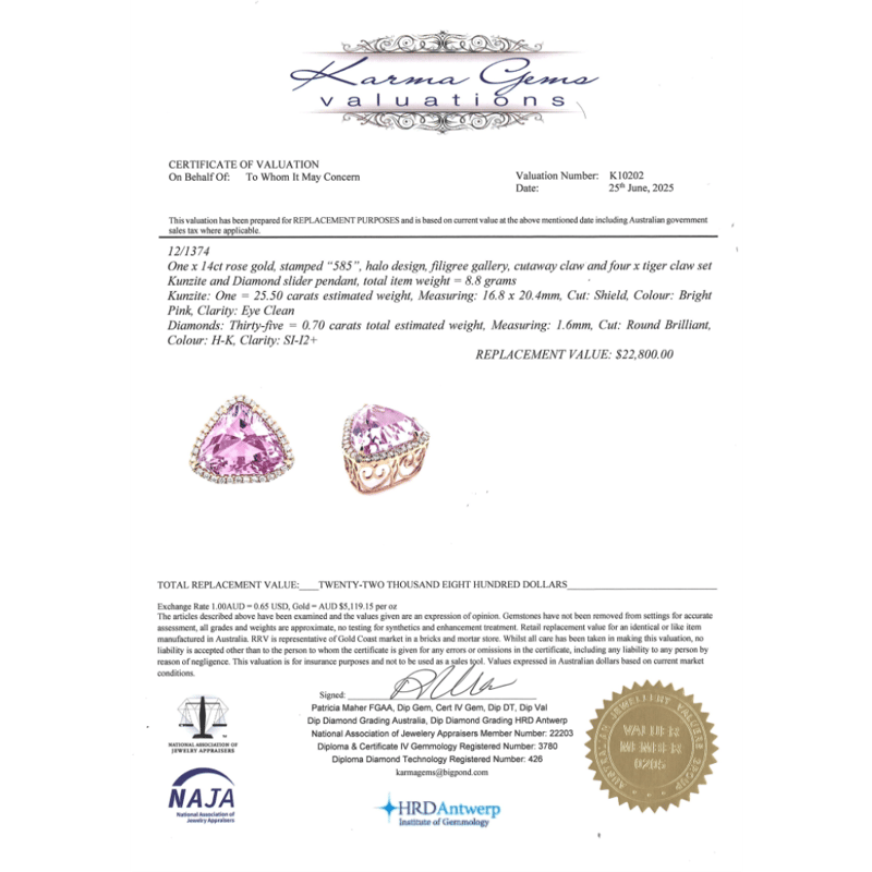 14K ROSE GOLD, 25.50CT KUNZITE AND DIAMOND, HALO COCKTAIL PENDANT. THE CENTRE FEATURES, ONE SHIELD CUT, BRIGHT PINK, KUNZITE (25.50CT, EYE CLEAN CLARITY), CLAW SET. SURROUNDING THE CENTRE IN A HALO ARE, 35 ROUND BRILLIANT CUT, DIAMONDS (0.70CT TDW, H-K COLOUR, SI-I2+ CLARITY), MICRO-CLAW SET. THE PENDANT HAS A FILIGREE DESIGN BASKET. Valuations Provided by an Independent Third-Party Professional Not Directly Associated With Lloyds Auctions at AUD $22,800.00This valuation has been conducted by an independent third-party professional. The valuation amount is an assessment by the issuing valuer and does not reflect the auction value of the item. Any inquiries regarding the valuation should be directed to the issuing valuer (refer to contact details on the certificate), as Lloyds Auctions has no affiliation or influence over the valuation, the valuer, or the stated amount. Condition: Good - Refer Images 0645886+5308