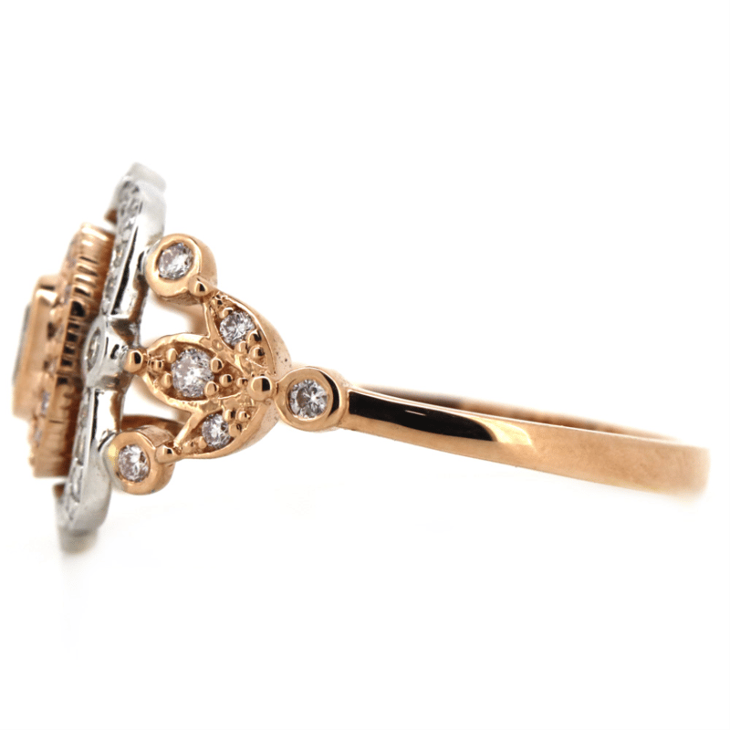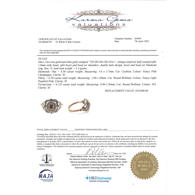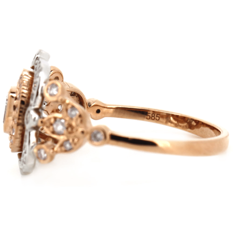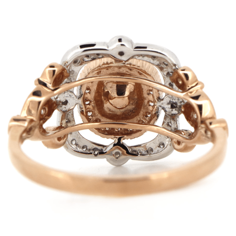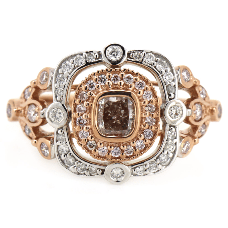 14K ROSE/WHITE GOLD, FANCY PINK DIAMOND AND DIAMOND, ANTIQUE INSPIRED RING. THE CENTRE FEATURES, ONE CUSHION CUT, PINK CHAMPAGNE DIAMOND (0.30CT, SI CLARITY), BEZEL SET. ENCOMPASSING THE CENTRE AND DECORATING RING SHOULDERS ARE 30 ROUND BRILLIANT CUT, FANCY PURPLISH PINK, DIAMONDS (0.20CT TDW, SI CLARITY) AND 24 ROUND BRILLIANT CUT DIAMONDS (0.135CT TDW, H-I COLOUR, SI CLARITY) BEZEL/BEAD SET. RING SIZE N.