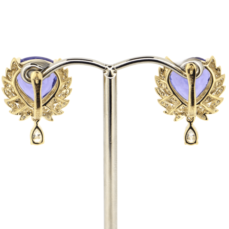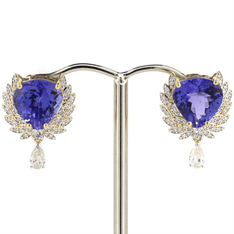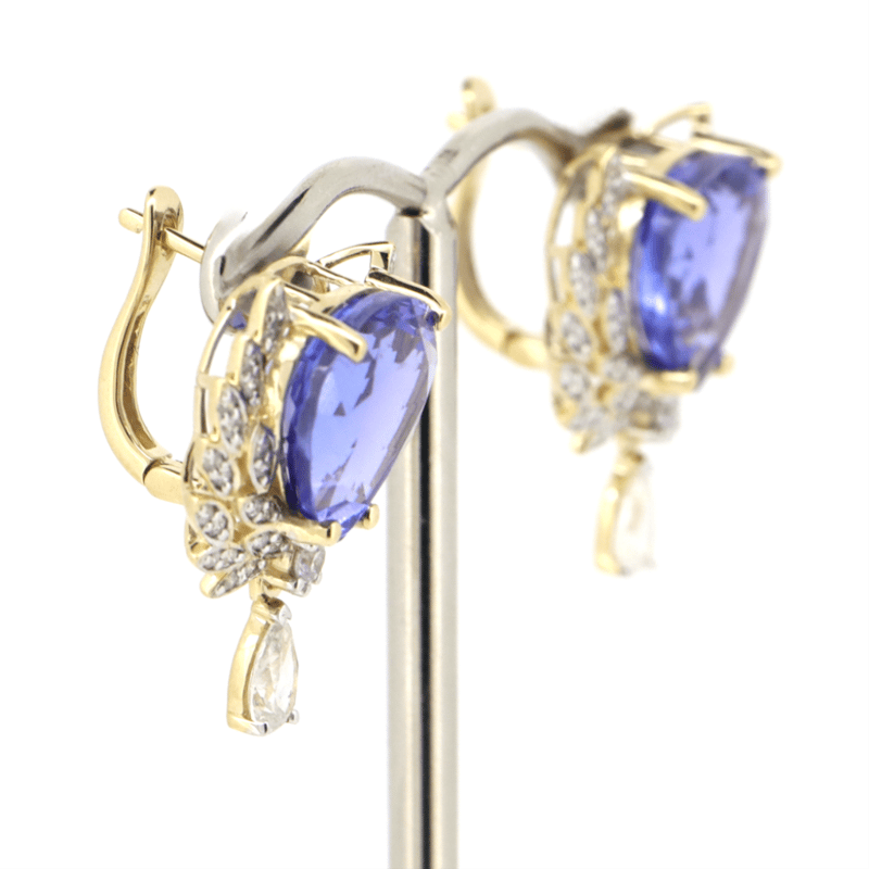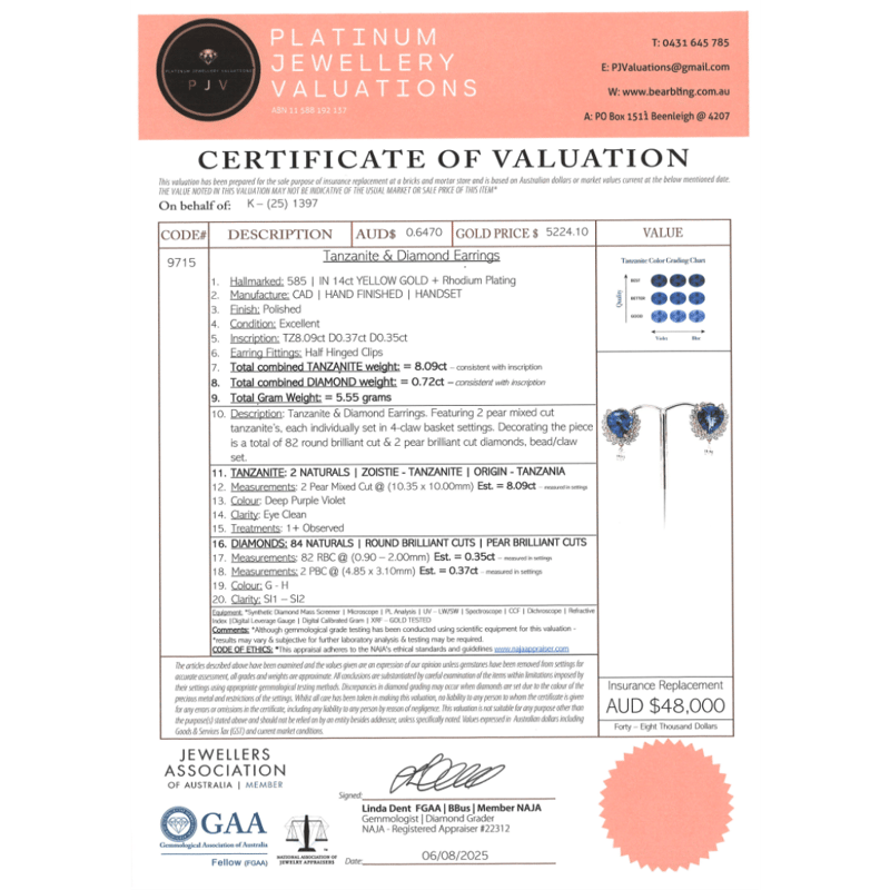 14K YELLOW GOLD, TANZANITE AND DIAMOND, EARRINGS. THE CENTRE FEATURES, 2 PEAR MIXED CUT, DEEP PURPLE VIOLET, TANZANITE'S (8.09CT TSW, EYE CLEAN), 4 CLAW SET. DECORATING THE PIECE ARE, 82 ROUND BRILLIANT CUT AND 2 PEAR BRILLIANT CUT, DIAMONDS (0.72CT TDW, G-H COLOUR, SI1-SI2 CLARITY), BEAD/CLAW SET. THE EARRINGS FEATURE HALF HINGED CLIPS. Valuations Provided by an Independent Third-Party Professional Not Directly Associated With Lloyds Auctions at AUD $48,000.00This valuation has been conducted by an independent third-party professional. The valuation amount is an assessment by the issuing valuer and does not reflect the auction value of the item. Any inquiries regarding the valuation should be directed to the issuing valuer (refer to contact details on the certificate), as Lloyds Auctions has no affiliation or influence over the valuation, the valuer, or the stated amount. Condition: Good - Refer Images 0645886+5316