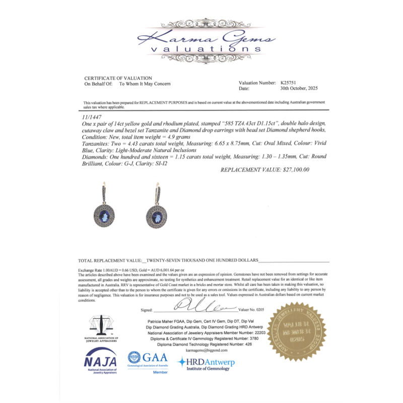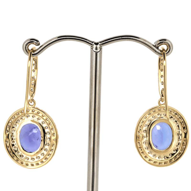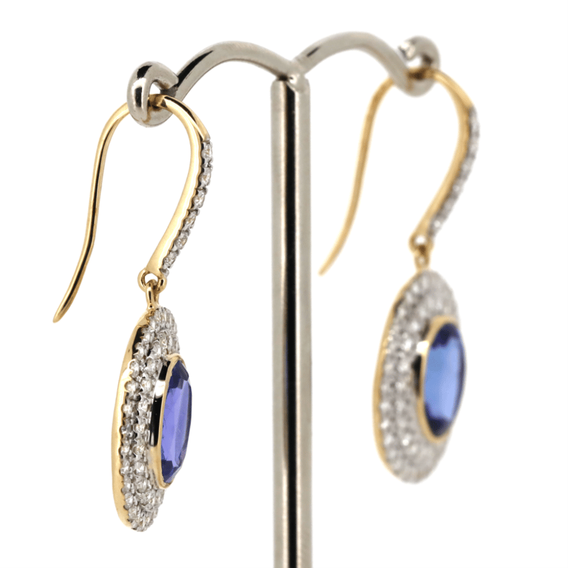 14K YELLOW GOLD, TANZANITE'S AND DIAMOND, DOUBLE HALO DROP EARRINGS. THE CENTRES FEATURE, 2 OVAL MIXED CUT, TANZANITES (4.43CT TSW, LIGHT MODERATE NATURAL INCLUSIONS), BEZEL SET. SURROUNDING THE CENTRE IN DOUBLE HALOS AND DECORATING HOOKS ARE, 116 ROUND BRILLIANT CUT, DIAMONDS (1.15CT TDW, G-J COLOUR, SI-I2 CLARITY), BEAD SET. THE EARRINGS FEATURE SHEPHERDS HOOKS.