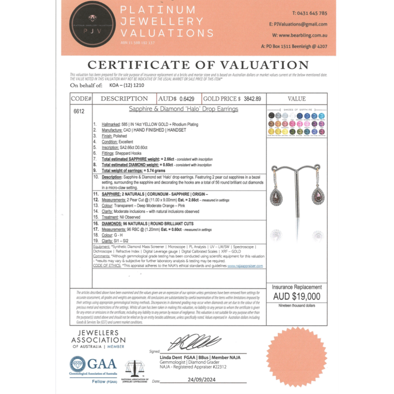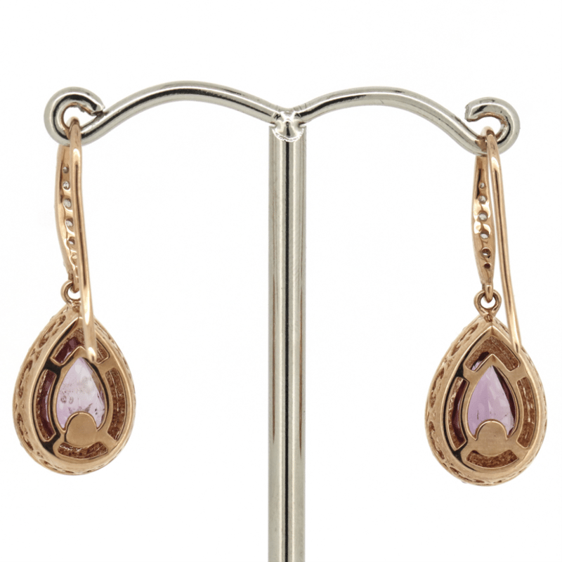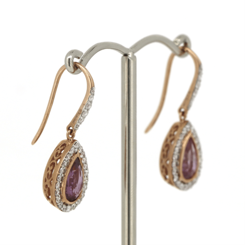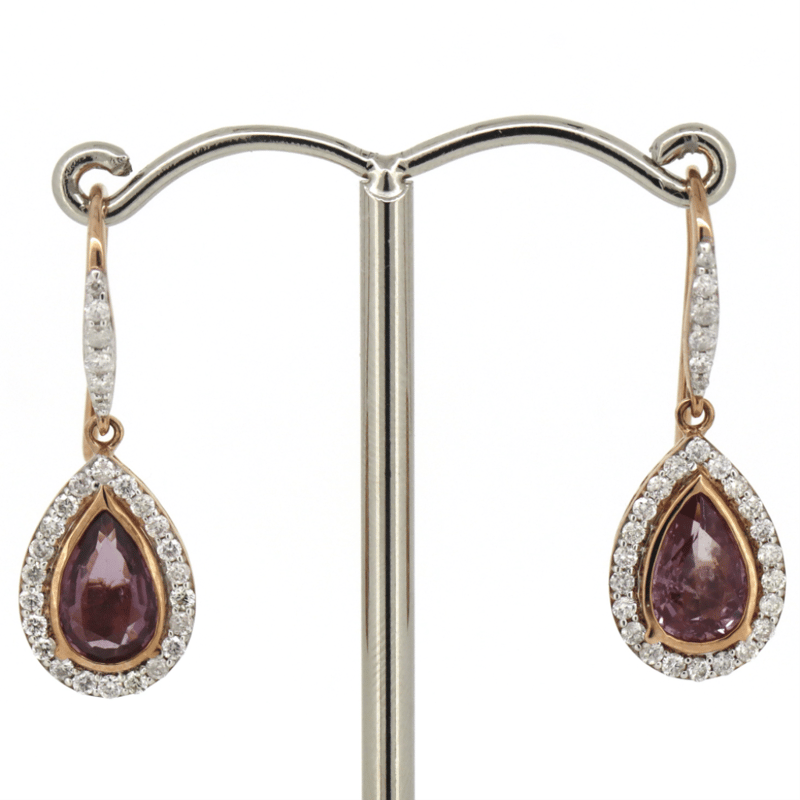 14K YELLOW GOLD, PINK SAPPHIRE AND DIAMOND, HALO DROP EARRINGS. THE DROPS FEATURE, 2 PEAR CUT, DEEP MODERATE ORANGE-PINK, SAPPHIRES (2.66CT TSW, MODERATE INCLUSIONS), BEZEL SET. SURROUNDING THE CENTRES IN HALOS AND DECORATING THE HOOKS ARE, 56 ROUND BRILLIANT CUT, DIAMONDS (0.60CT TDW, G-H COLOUR, SI1-SI2 CLARITY), MICRO-CLAW SET IN WHITE GOLD. THE EARRINGS FEATURE SHEPPARD HOOKS.