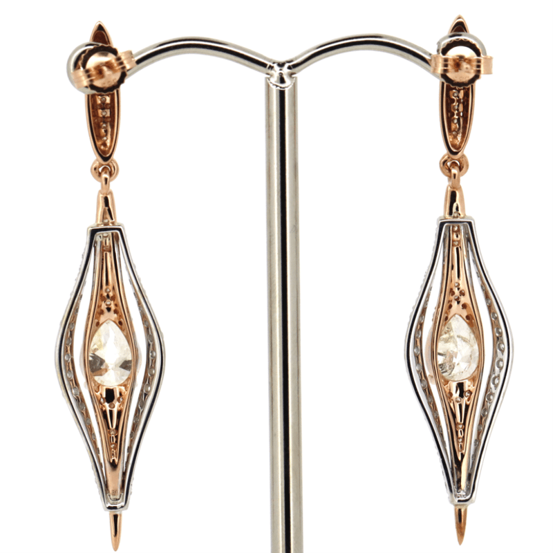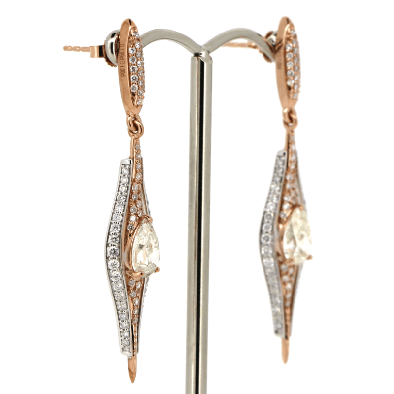 14K ROSE/WHITE GOLD AND DIAMOND, DROP EARRINGS. THE CENTRES FEATURE, 2 PEAR CUT, DIAMONDS (1.99CT TDW, I-J COLOUR, P2 CLARITY), 4 CLAW BASKET SET. DECORATING THE CENTRE ARE, 152 ROUND BRILLIANT CUT, DIAMONDS (1.00CT TDW, G-H COLOUR, SI1-SI2 CLARITY), BEAD SET. Valuations Provided by an Independent Third-Party Professional Not Directly Associated With Lloyds Auctions at AUD $33,000.00This valuation has been conducted by an independent third-party professional. The valuation amount is an assessment by the issuing valuer and does not reflect the auction value of the item. Any inquiries regarding the valuation should be directed to the issuing valuer (refer to contact details on the certificate), as Lloyds Auctions has no affiliation or influence over the valuation, the valuer, or the stated amount. Condition: Good - Refer Images 0645886+5347