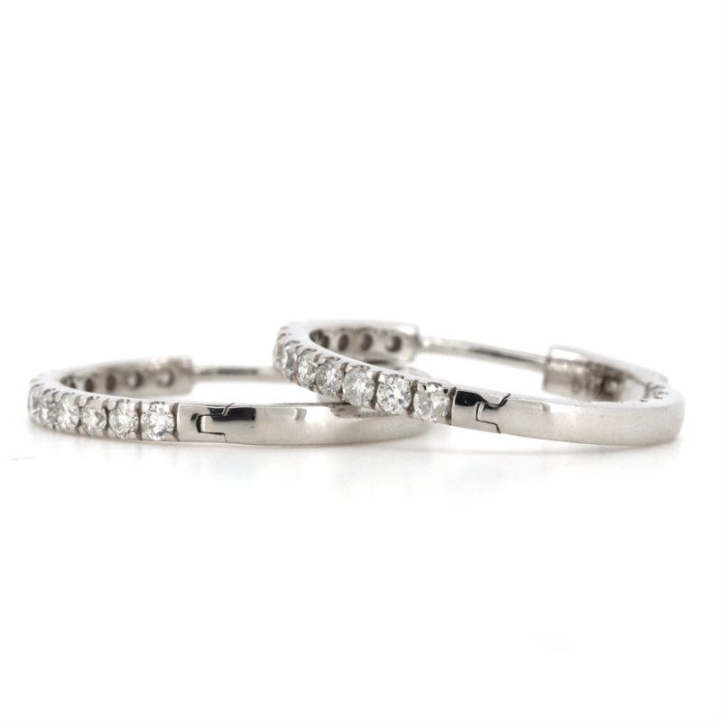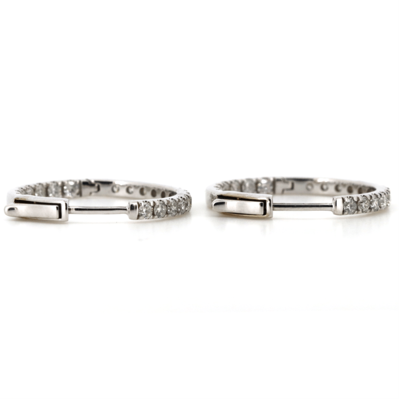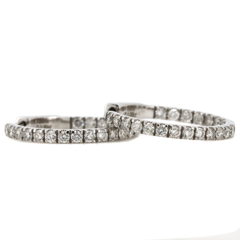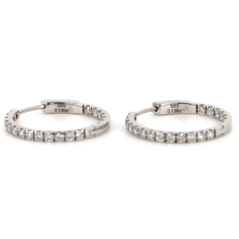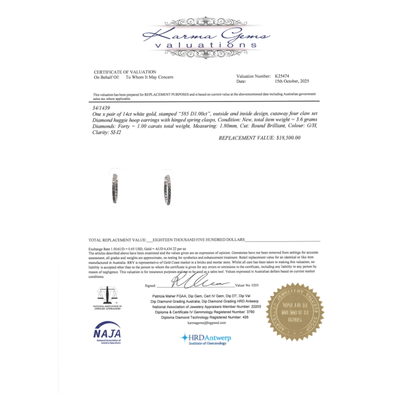 14K WHITE GOLD AND 1.00CT TDW DIAMOND, HOOP EARRINGS. THE HOOPS FEATURES, 42 ROUND BRILLIANT CUT, DIAMONDS (1.00CT TDW, G-H COLOUR, SI-I2 CLARITY), CHANNEL SET. THE EARRINGS HAVE HINGED SNAP CLOSURES. Valuations Provided by an Independent Third-Party Professional Not Directly Associated With Lloyds Auctions at AUD $18,500.00This valuation has been conducted by an independent third-party professional. The valuation amount is an assessment by the issuing valuer and does not reflect the auction value of the item. Any inquiries regarding the valuation should be directed to the issuing valuer (refer to contact details on the certificate), as Lloyds Auctions has no affiliation or influence over the valuation, the valuer, or the stated amount. Condition: Good - Refer Images 0645886+5375