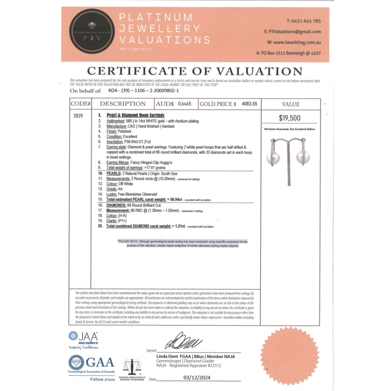 14K WHITE GOLD, OFF-WHITE CULTURED SOUTH SEA PEARL AND DIAMOND, HOOP EARRINGS. THE DESIGN FEATURES, 2 ROUND, OFF-WHITE, CULTURED SOUTH SEA PEARLS (15.00MM SIZE, AA GRADE, FEW BLEMISHES), HALF DRILLED/CAP SET. ACCOMPANYING THE DESIGN ARE, 66 ROUND BRILLIANT CUT, DIAMONDS (1.21CT TDW, H-K COLOUR, P1+ CLARITY), BEAD SET. THE EARRINGS HAVE FANCY HINGED-CLIP HUGGIE CLOSURES.