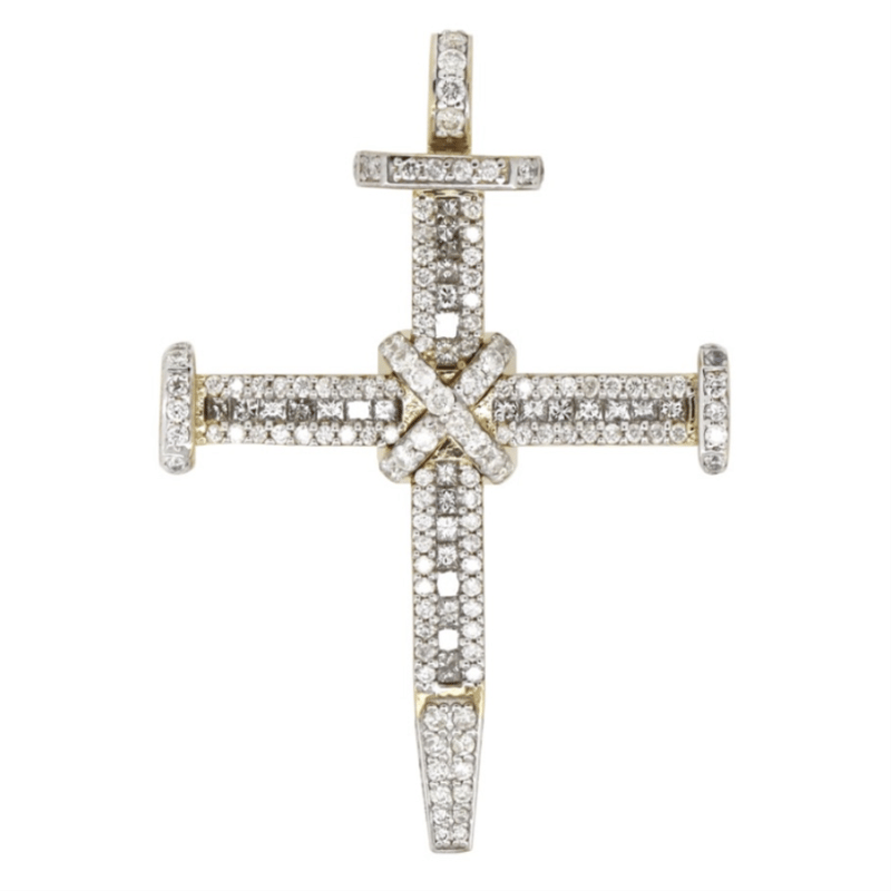 14K YELLOW GOLD, 1.56CT TDW DIAMOND, CRUCIFIX PENDANT. THE DESIGN FEATURES, 28 SQUARE PRINCESS CUT, DIAMONDS (0.54CT TDW, H-I COLOUR, SI2-P1 CLARITY), CHANNEL SET. ACCOMPANYING THE DESIGN ARE, 144 ROUND BRILLIANT CUT, DIAMONDS (1.029CT TDW, H-I COLOUR, SI2-P1 CLARITY), BEAD SET.