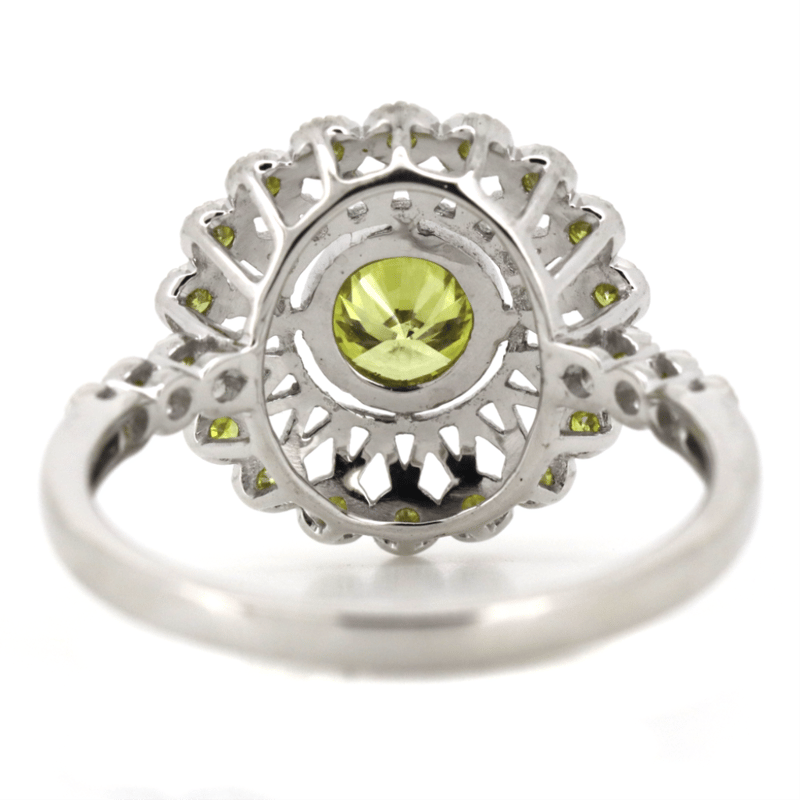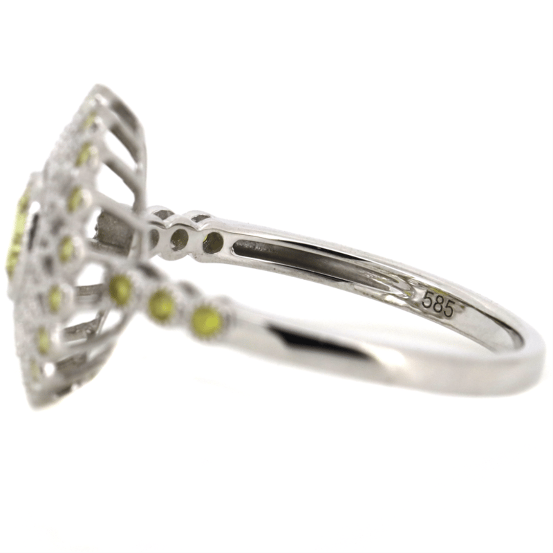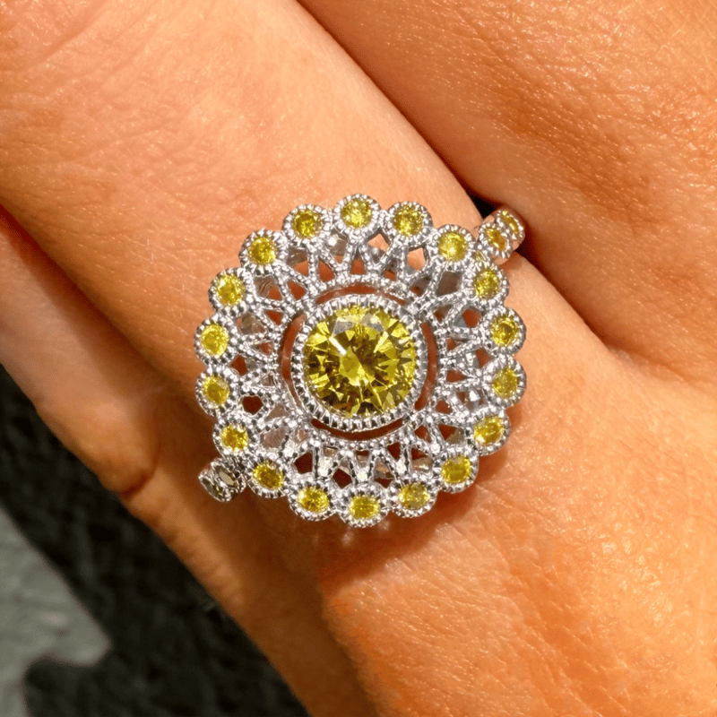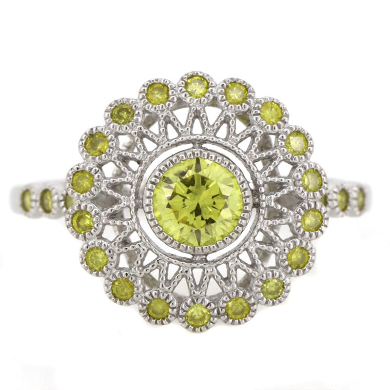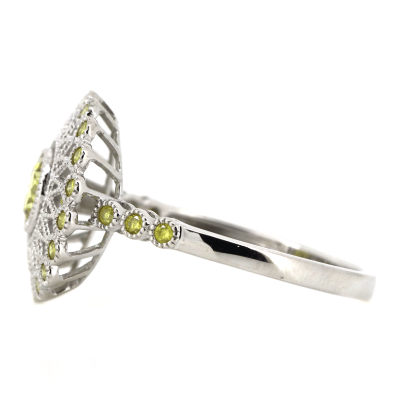 14K WHITE GOLD AND FANCY YELLOW DIAMOND, ANTIQUE INSPIRED RING. THE CENTRE FEATURES, ONE OLD MINE CUT, YELLOW DIAMOND (0.46CT, SI CLARITY, TREATED), BEZEL SET WITH MILLEGRAIN DETAIL. SURROUNDING THE CENTRE IN A HALO AND DECORATING THE BAND ARE, 24 ROUND BRILLIANT CUT, YELLOW DIAMONDS (0.29CT TDW, SI-I1 CLARITY, TREATED), BEZEL SET WITH MILLEGRAIN DETAIL. RING SIZE P.