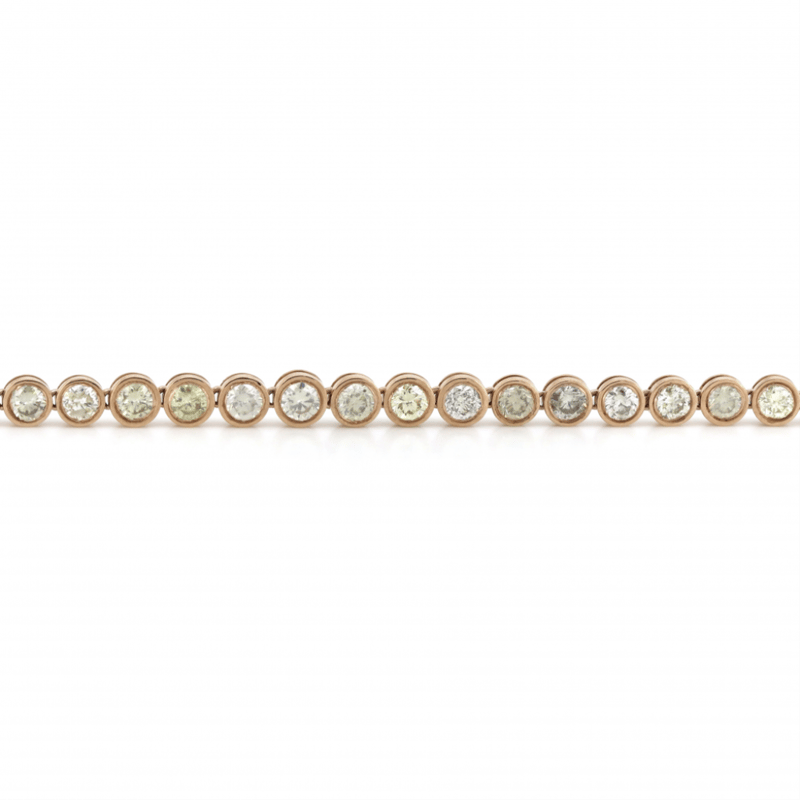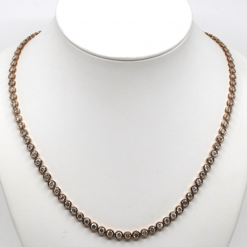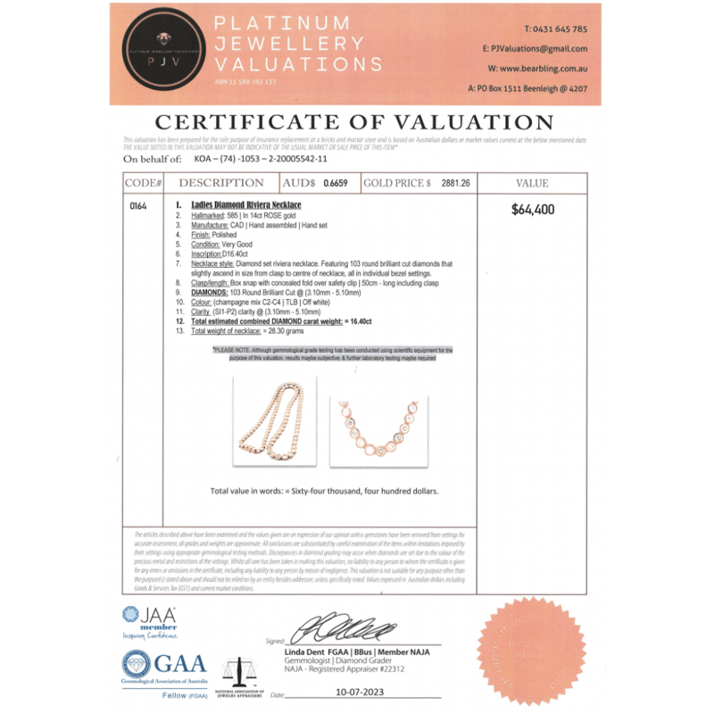 14K ROSE GOLD, 16.40CT CHAMPAGNE DIAMOND, RIVIERA NECKLACE. THE DESIGN FEATURES, 103 ROUND BRILLIANT CUT, CHAMPAGNE, DIAMONDS (16.40CT TDW, C2-C4 COLOUR, SI1-P2 CLARITY), BEZEL SET. THE NECKLACE HAS A BOX LOCK CLASP, WITH ONE SAFETY LATCH. NECKLACE LENGTH IS 50.5CM. Valuations Provided by an Independent Third-Party Professional Not Directly Associated With Lloyds Auctions at AUD $64,400.00This valuation has been conducted by an independent third-party professional. The valuation amount is an assessment by the issuing valuer and does not reflect the auction value of the item. Any inquiries regarding the valuation should be directed to the issuing valuer (refer to contact details on the certificate), as Lloyds Auctions has no affiliation or influence over the valuation, the valuer, or the stated amount. Condition: Good - Refer Images 0645886+5328
