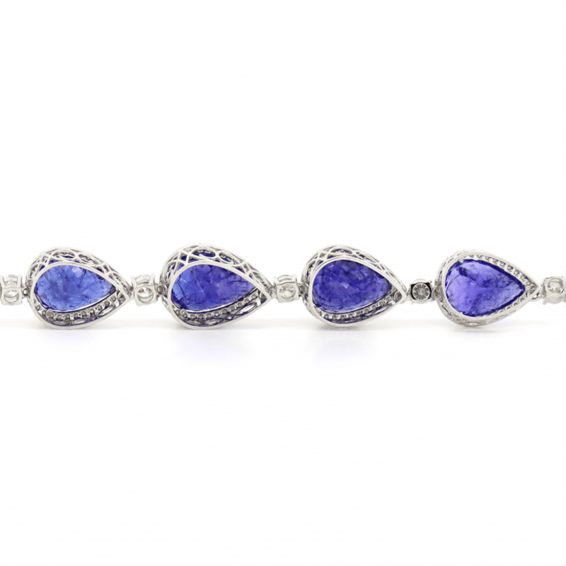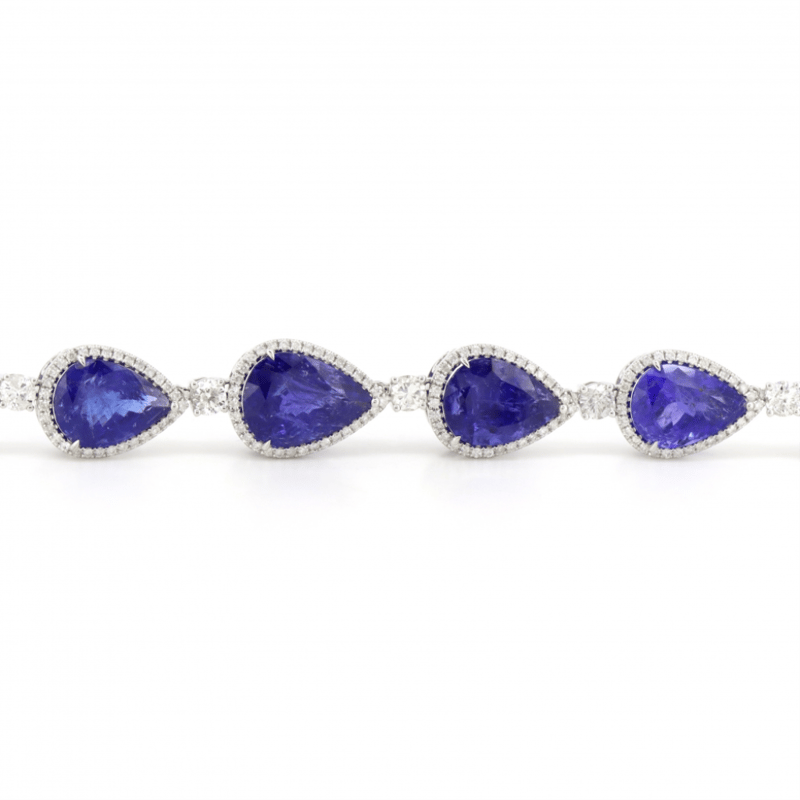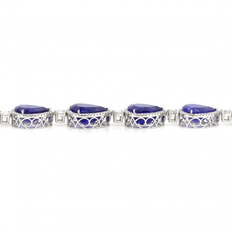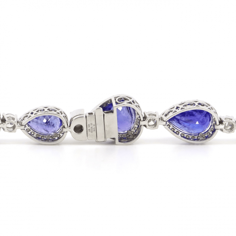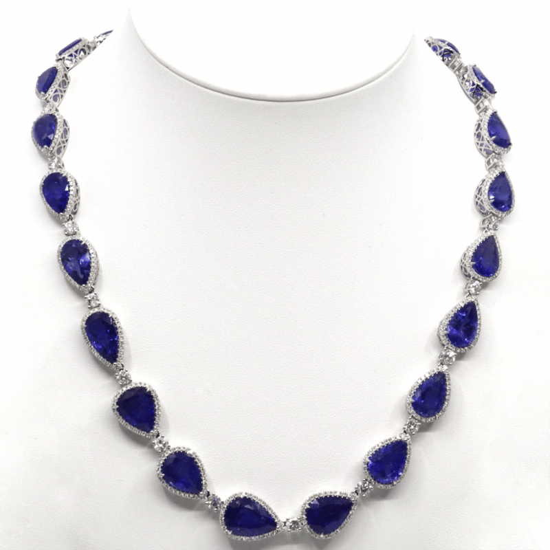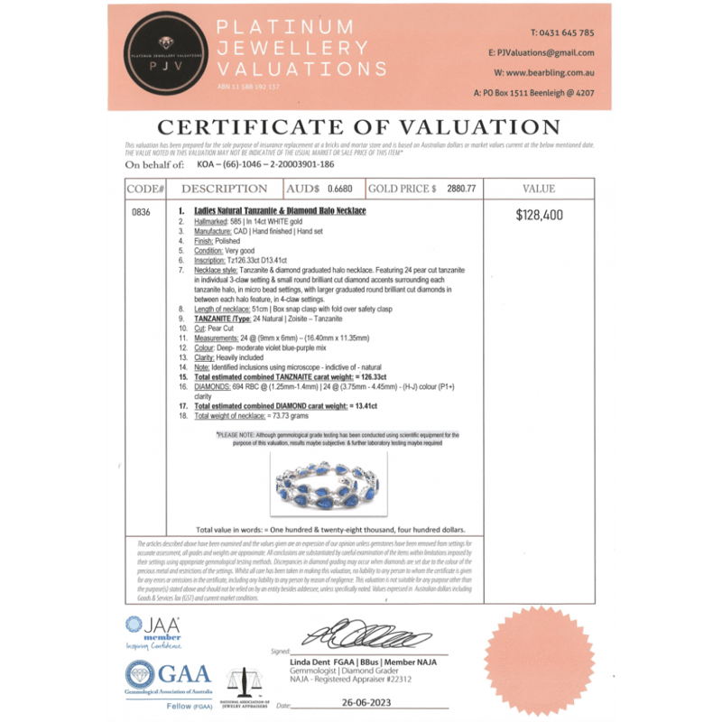 14K WHITE GOLD, TANZANITE AND DIAMOND, HALO NECKLACE. THE DESIGN FEATURES, 24 PEAR CUT, DEEP VIOLET-BLUE-PURPLE, TANZANITES (126.33CT TSW, HEAVILY INCLUDED), 3 CLAW SET. SURROUNDING THE STONES IN INDIVIDUAL HALOS AND ALTERNATING BETWEEN ARE, 718 ROUND BRILLIANT CUT, DIAMONDS (13.41CT TDW, H-J COLOUR, P1+ CLARITY), CLAW SET. THE NECKLACE HAS A BOX LOCK CLASP, WITH ONE SAFETY LATCH. NECKLACE LENGTH IS 51.5CM. Valuations Provided by an Independent Third-Party Professional Not Directly Associated With Lloyds Auctions at AUD $$128,400.00This valuation has been conducted by an independent third-party professional. The valuation amount is an assessment by the issuing valuer and does not reflect the auction value of the item. Any inquiries regarding the valuation should be directed to the issuing valuer (refer to contact details on the certificate), as Lloyds Auctions has no affiliation or influence over the valuation, the valuer, or the stated amount. Condition: Good - Refer Images 0645877+5234