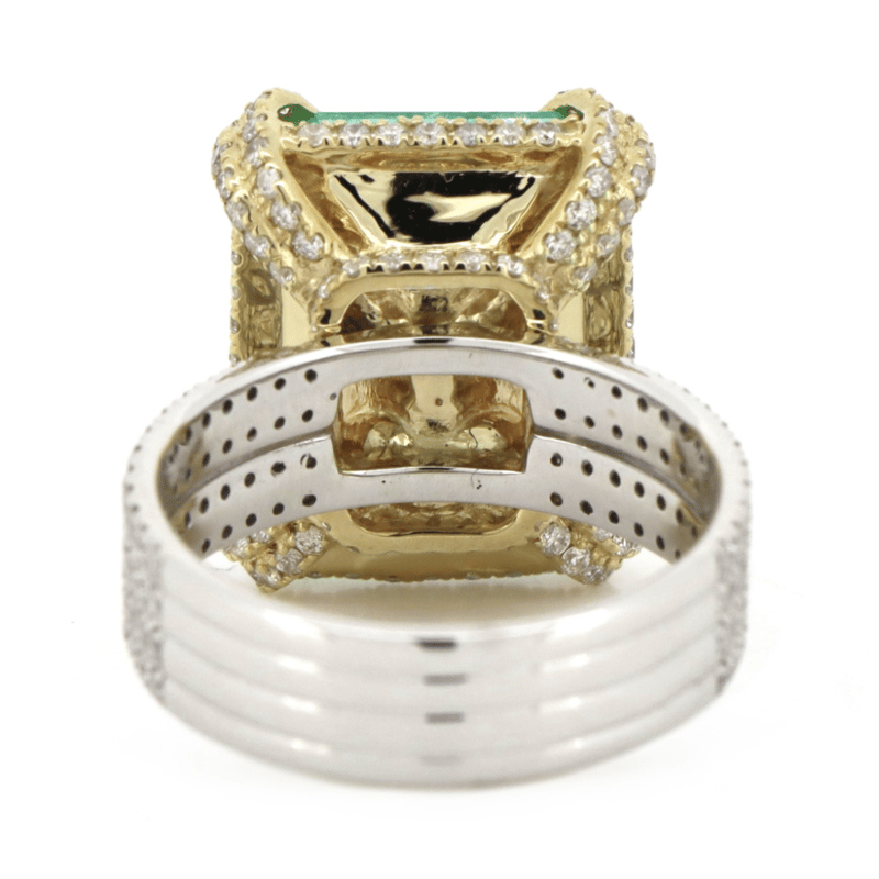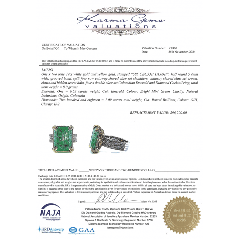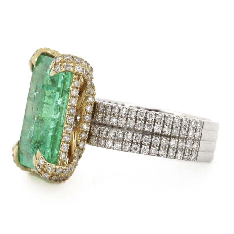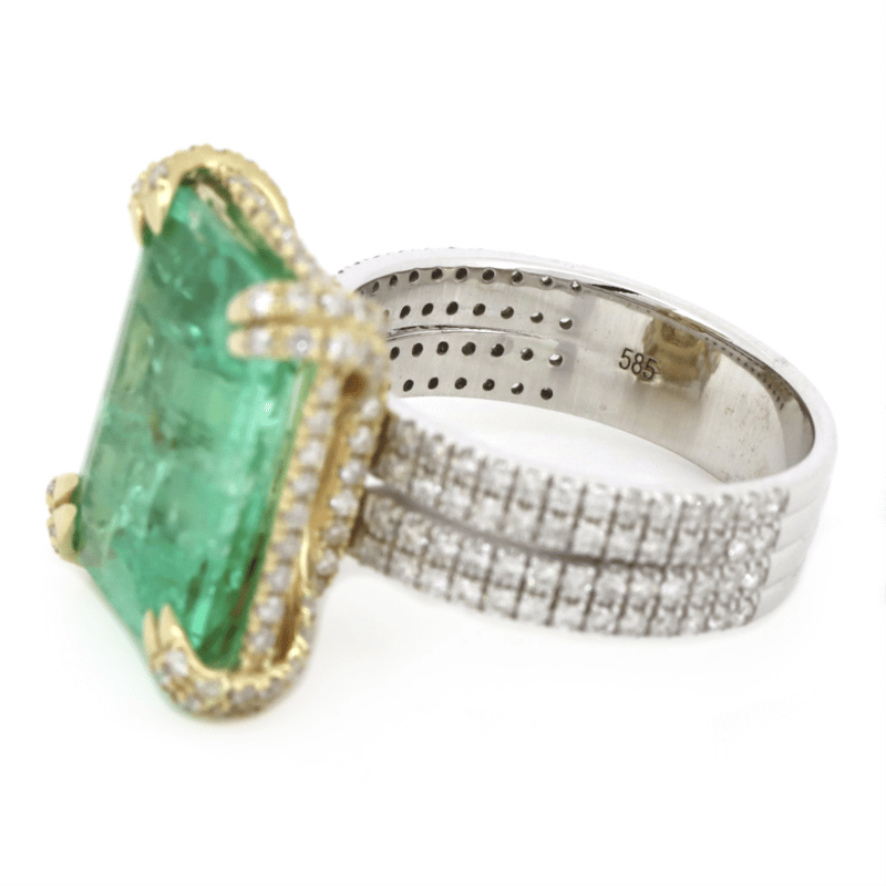 14K WHITE AND YELLOW GOLD, 6.53CT COLOMBIAN EMERALD AND DIAMOND, COCKTAIL RING. THE CENTRE FEATURES, ONE EMERALD CUT, BRIGHT MINT GREEN, COLOMBIAN EMERALD (6.53CT, NATURAL-INCLUSIONS), CLAW SET. DECORATING THE BAND ARE, 218 ROUND BRILLIANT CUT, DIAMONDS (1.09CT TDW, G-H COLOUR, I1-2 CLARITY), MICRO-CLAW SET. RING SIZE M.