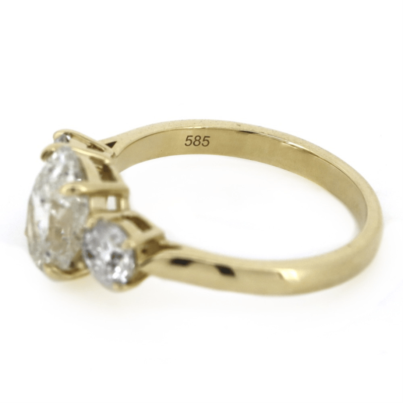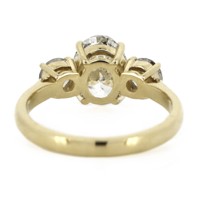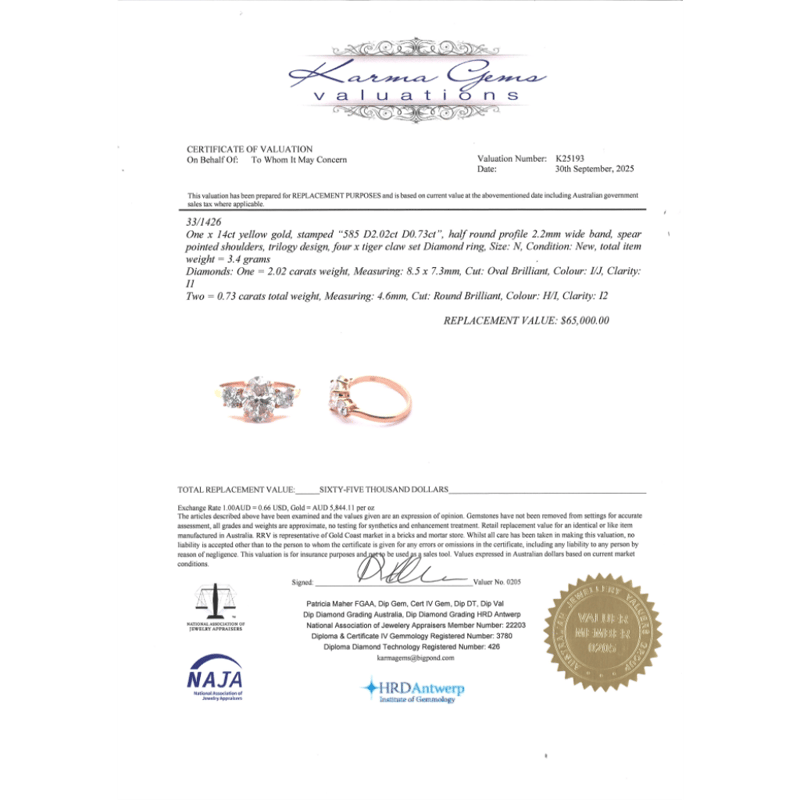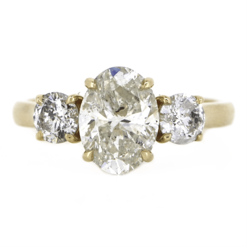 14K YELLOW GOLD AND DIAMOND, TRILOGY RING. THE CENTRE FEATURES, ONE OVAL BRILLIANT CUT, DIAMOND (2.02CT, I-J COLOUR, I1 CLARITY), 4 CLAW SET. FLANKING EITHER SIDE OF THE CENTRE ARE, 2 ROUND BRILLIANT CUT, DIAMONDS (0.73CT TDW, H-I COLOUR, I2 CLARITY), 4 CLAW SET. RING SIZE N.
