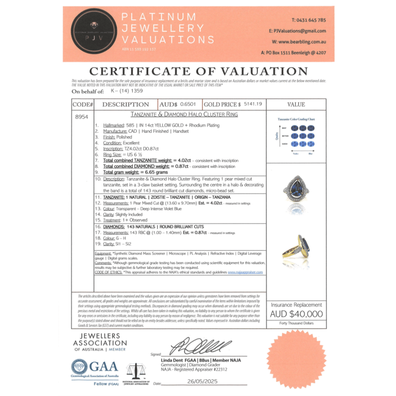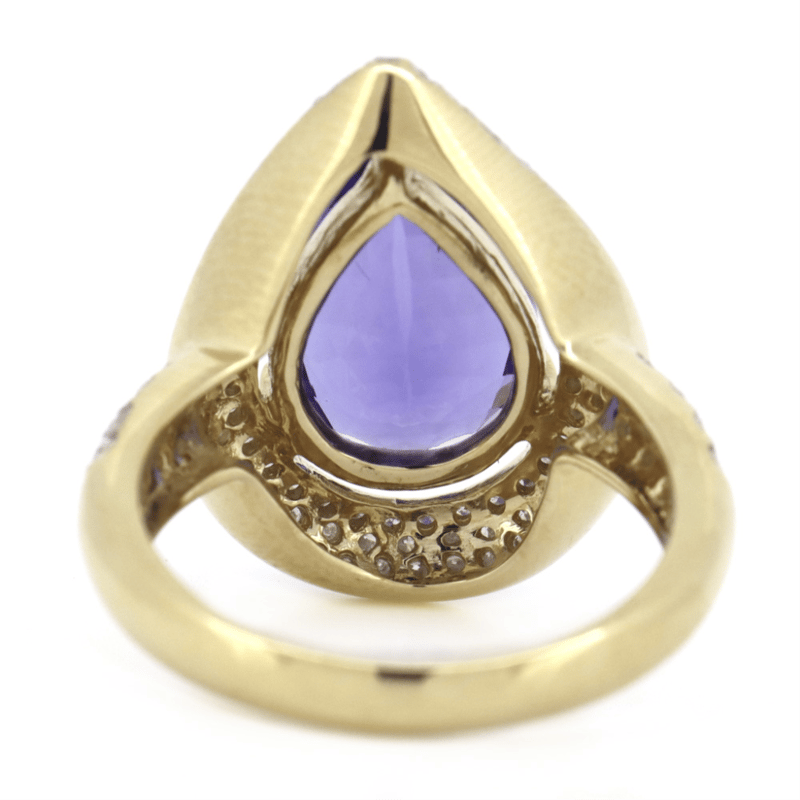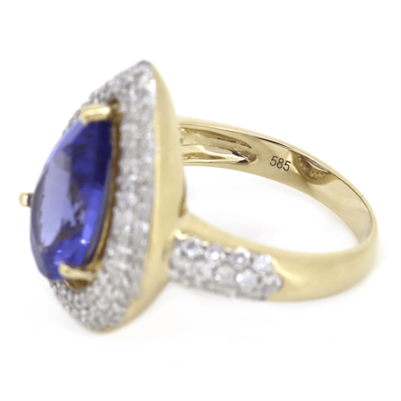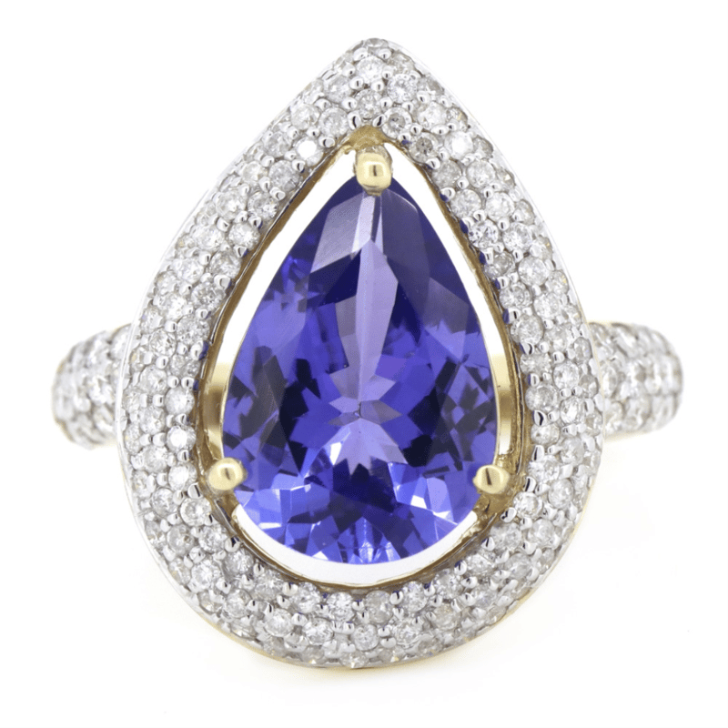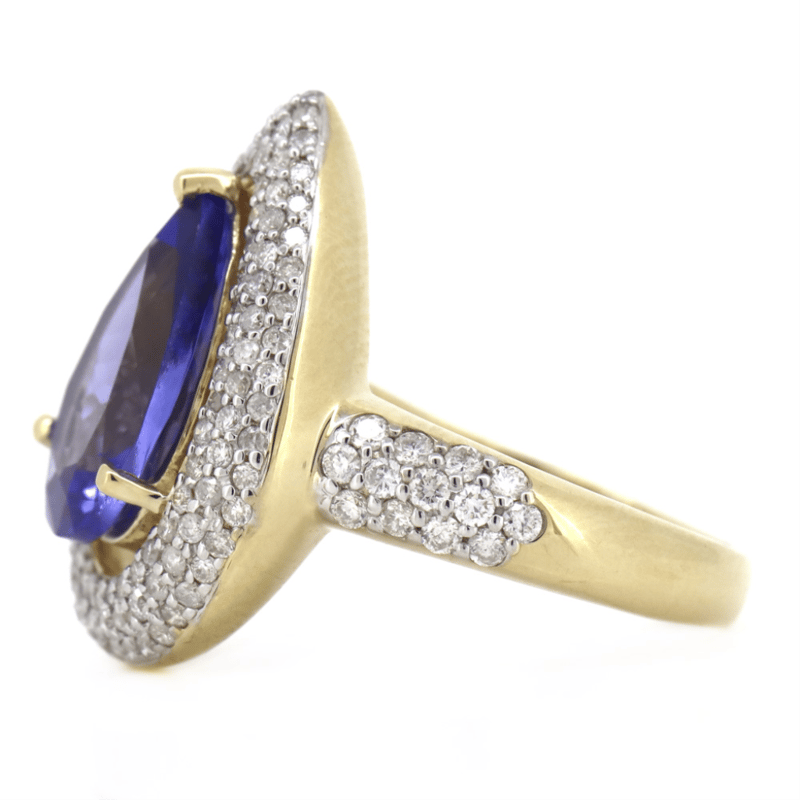14K YELLOW GOLD, TANZANITE AND DIAMOND, HALO CLUSTER RING. THE CENTRE FEATURES, ONE PEAR MIXED CUT, DEEP INTENSE VIOLET-BLUE, TANZANITE (4.02CT, SLIGHTLY INCLUDED), 3-CLAW SET. SURROUNDING THE CENTRE IN A HALO AND DECORATING THE BAND ARE, 143 ROUND BRILLIANT CUT, DIAMONDS (0.87CT TDW, G-H COLOUR, SI1-SI2 CLARITY), MICRO-BEAD SET. RING SIZE M 1/2.