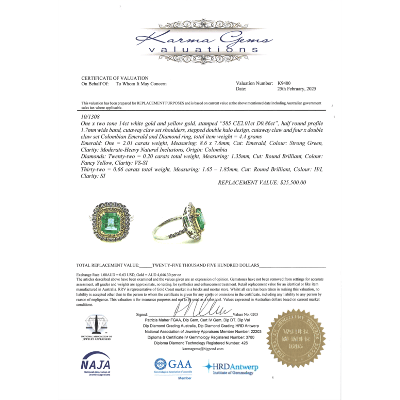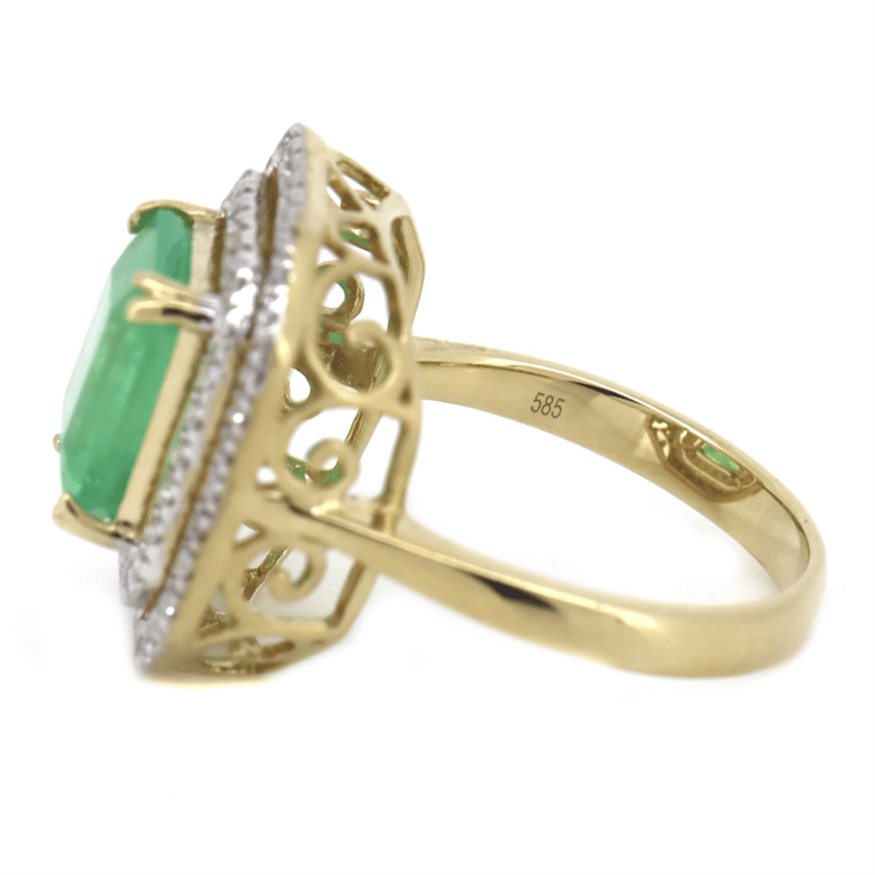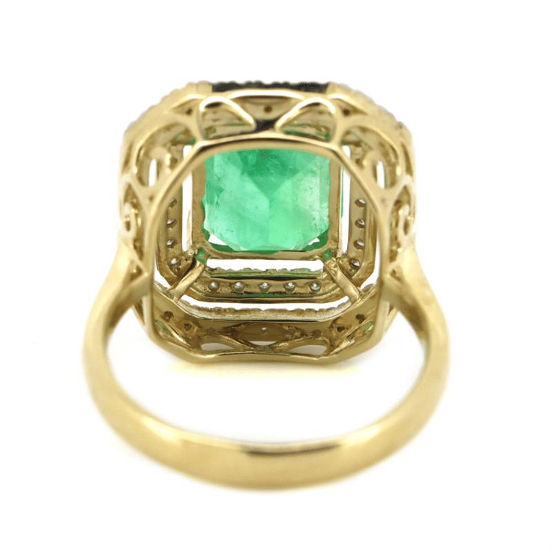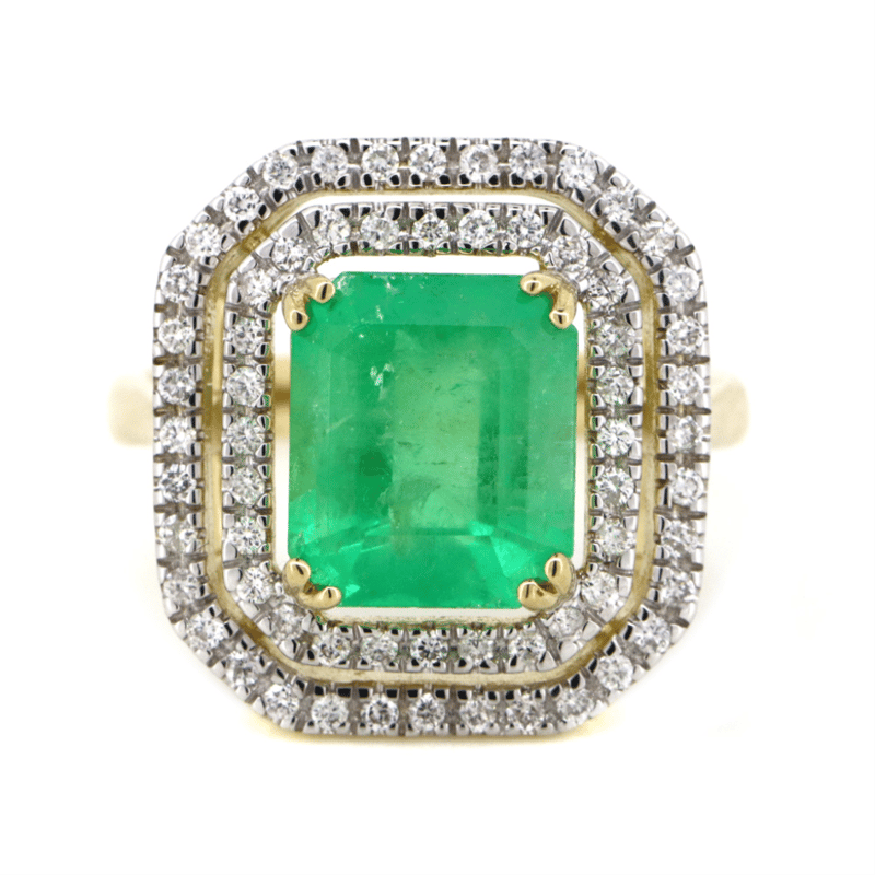 14K YELLOW GOLD, 3.37CT COLOMBIAN EMERALD AND DIAMOND, DOUBLE HALO RING. THE CENTRE FEATURES, ONE EMERALD CUT, BRIGHT GREEN, COLOMBIAN EMERALD (3.37CT, SLIGHT-MODERATELY INCLUDED), DOUBLE 4 CLAW SET. SURROUNDING THE CENTRE IN A DOUBLE HALO ARE, 64 ROUND BRILLIANT CUT, DIAMONDS (0.38CT TDW, H-I COLOUR, SI-I1 CLARITY), MICRO-BEAD SET IN WHITE GOLD. RING SIZE M.