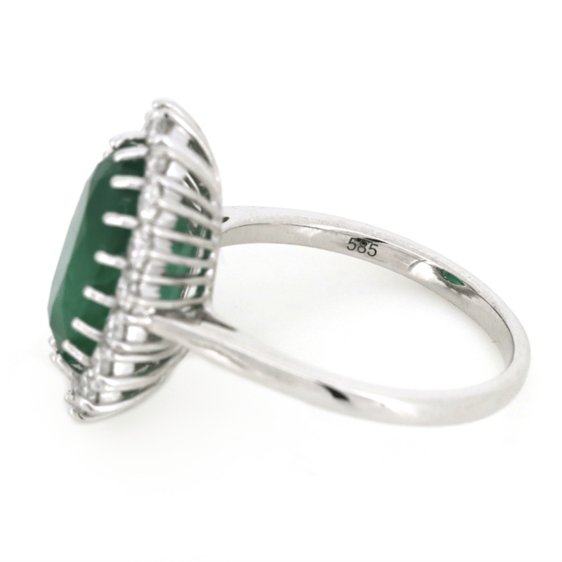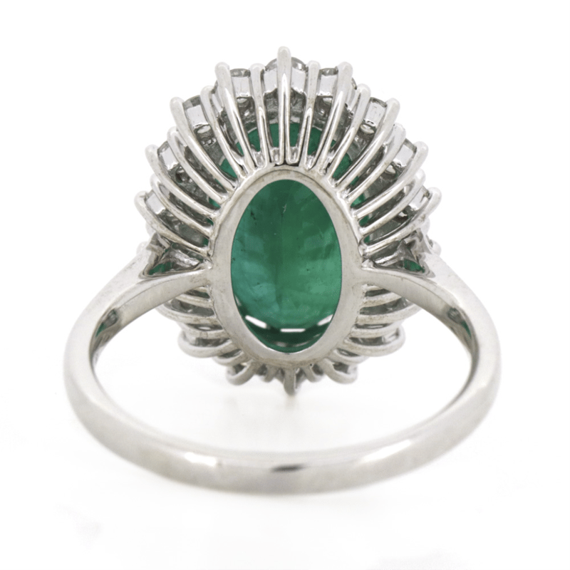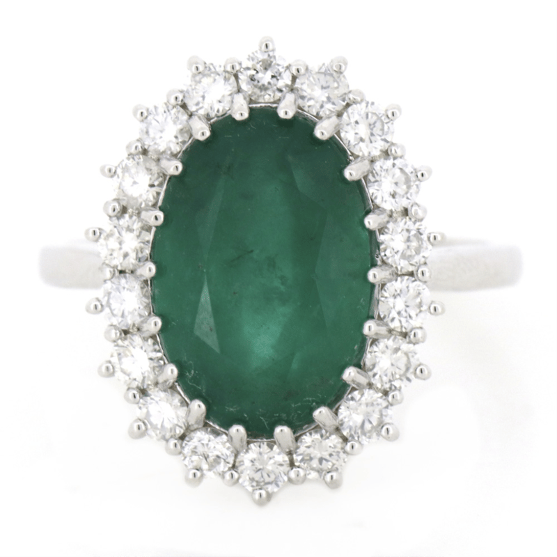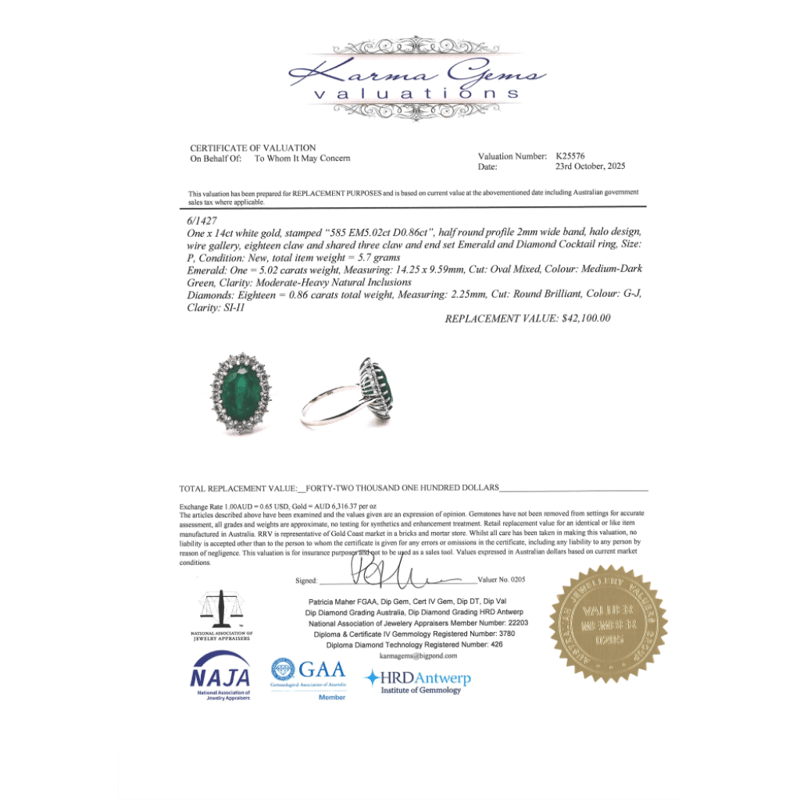 14K WHITE GOLD, EMERALD AND DIAMOND, HALO RING. THE CENTRE FEATURES, ONE OVAL CUT, MEDIUM DARK GREEN, EMERALD (5.02CT, MODERATE-HEAVY INCLUSIONS), MULTI-CLAW SET. SURROUNDING THE CENTRE IN A HALO ARE, 18 ROUND BRILLIANT CUT, DIAMONDS (0.86CT TDW, G-J COLOUR SI-I1 CLARITY), CLAW SET. RING SIZE P. Valuations Provided by an Independent Third-Party Professional Not Directly Associated With Lloyds Auctions at AUD $$42,100.00This valuation has been conducted by an independent third-party professional. The valuation amount is an assessment by the issuing valuer and does not reflect the auction value of the item. Any inquiries regarding the valuation should be directed to the issuing valuer (refer to contact details on the certificate), as Lloyds Auctions has no affiliation or influence over the valuation, the valuer, or the stated amount. Condition: Good - Refer Images 0645877+5207