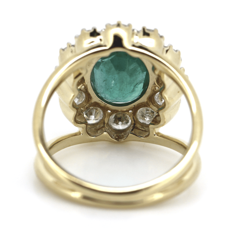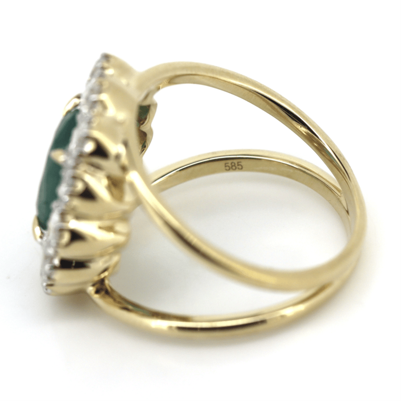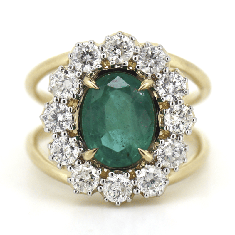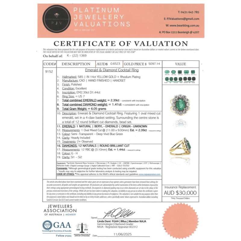 14K YELLOW GOLD, EMERALD AND DIAMOND, HALO SPLIT BAND RING. THE CENTRE FEATURES, ONE OVAL MIXED CUT, DEEP VIVID BLUSIH GREEN, EMERALD (2.39CT, HEAVILY INCLUDED), ENHANCED), 4 CLAW SET IN YELLOW GOLD. SURROUNDING THE CENTRE IN A HALO ARE, 12 ROUND BRILLIANT CUT, DIAMONDS (1.44CT TDW, G-H COLOUR, SI1-SI2 CLARITY), BEAD SET IN WHITE GOLD. RING SIZE N 1/2. Valuations Provided by an Independent Third-Party Professional Not Directly Associated With Lloyds Auctions at AUD $$30,000.00This valuation has been conducted by an independent third-party professional. The valuation amount is an assessment by the issuing valuer and does not reflect the auction value of the item. Any inquiries regarding the valuation should be directed to the issuing valuer (refer to contact details on the certificate), as Lloyds Auctions has no affiliation or influence over the valuation, the valuer, or the stated amount. Condition: Good - Refer Images 0645877+5267