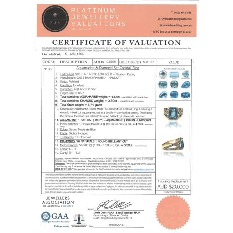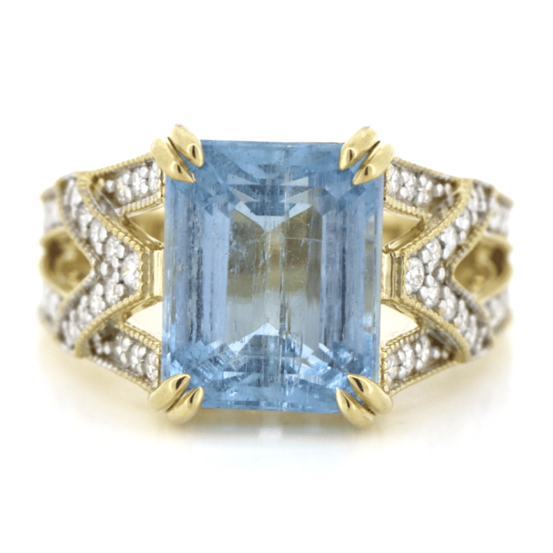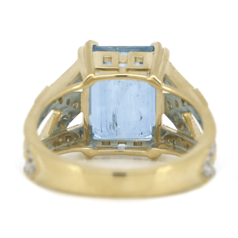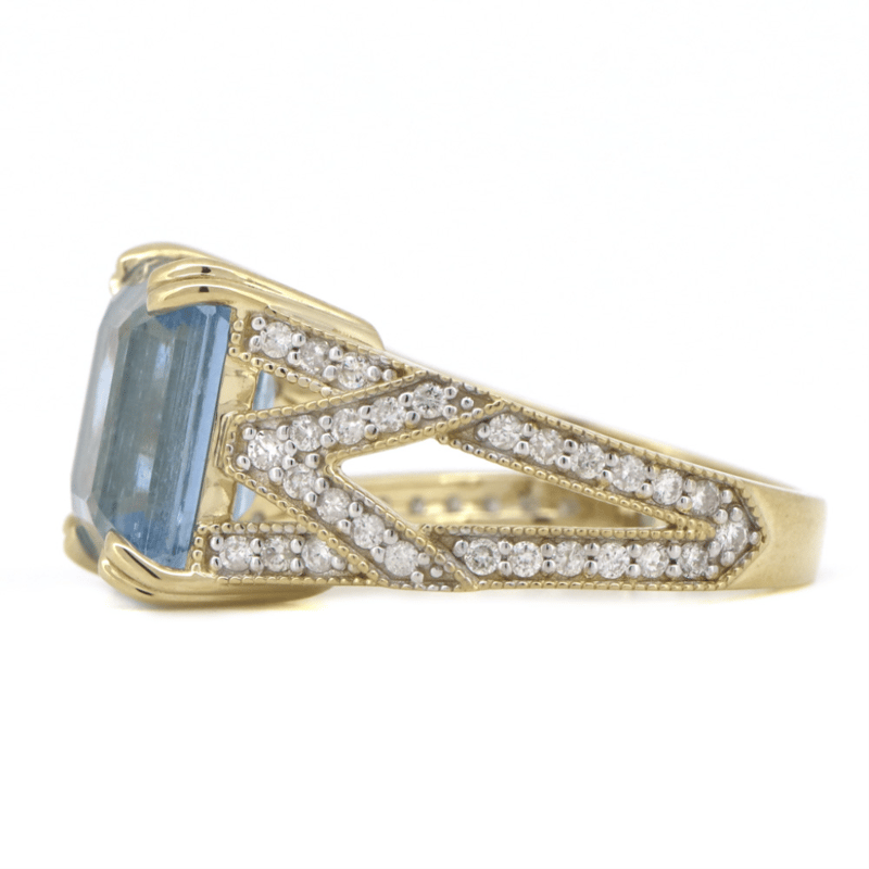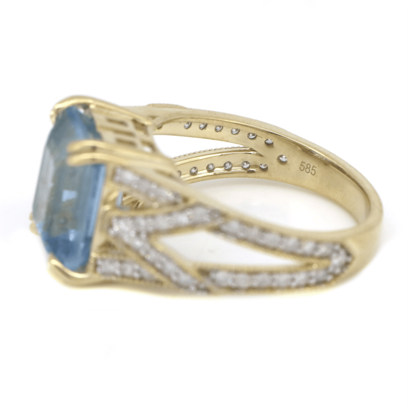 14K YELLOW GOLD, AQUAMARINE AND DIAMOND, DRESS RING. THE CENTRE FEATURES, ONE EMERALD MIXED CUT, STRONG MODERATE BLUE, AQUAMARINE (4.65CT, SLIGHTLY INCLUDED), 4 CLAW BASKET SET. DECORATING THE BAND/SHOULDERS ARE, 56 ROUND BRILLIANT CUT, DIAMONDS (0.50CT TDW, G-H COLOUR, SI1-SI2 CLARITY), BEAD SET. RING SIZE N.