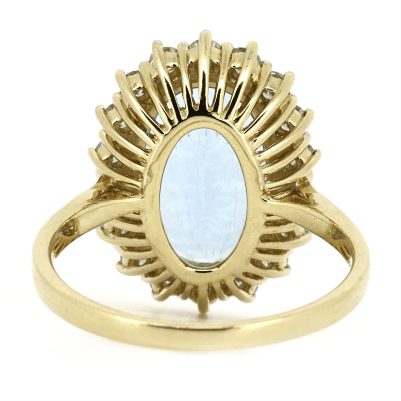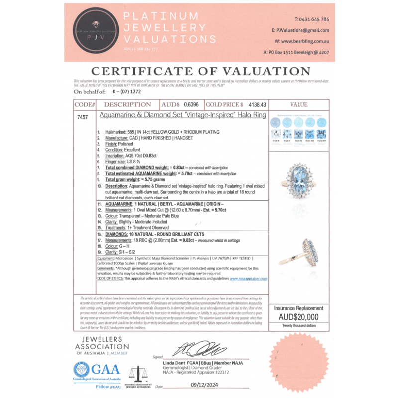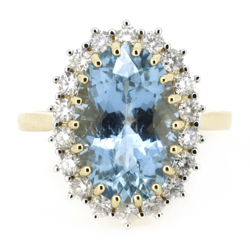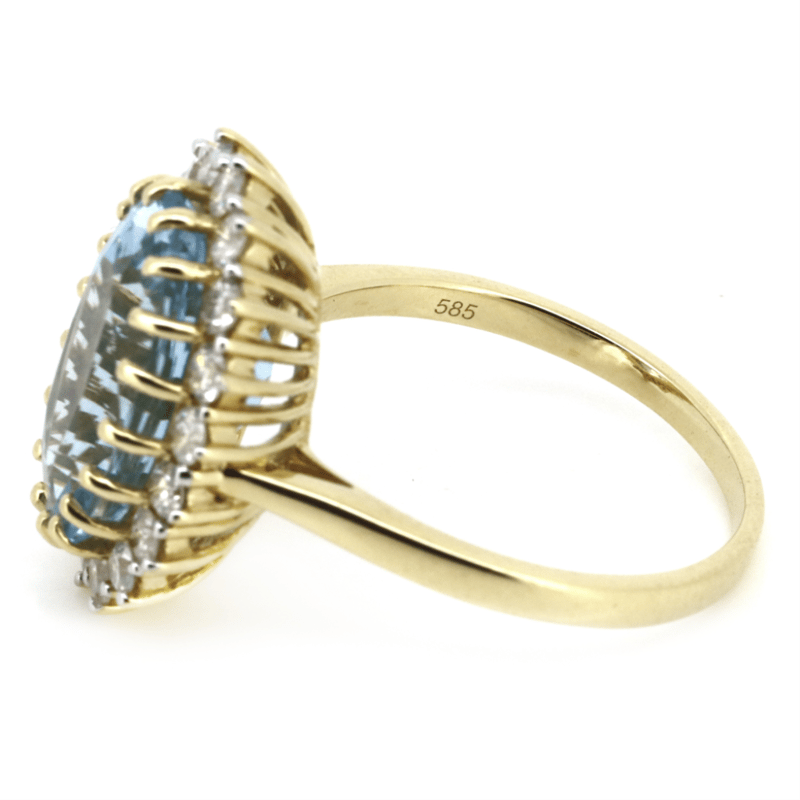 14K YELLOW GOLD, AQUAMARINE AND DIAMOND, STATEMENT HALO RING. THE CENTRE FEATURES, ONE OVAL MIXED CUT, MODERATE PALE BLUE, AQUAMARINE (5.70CT, EYE CLEAN CLARITY), MULTI-CLAW SET. SURROUNDING THE CENTRE IN A HALO ARE, 18 ROUND BRILLIANT CUT, DIAMONDS (0.83CT TDW, G-H COLOUR, SI1-SI2 CLARITY), CLAW SET. RING SIZE Q.
