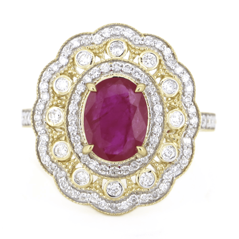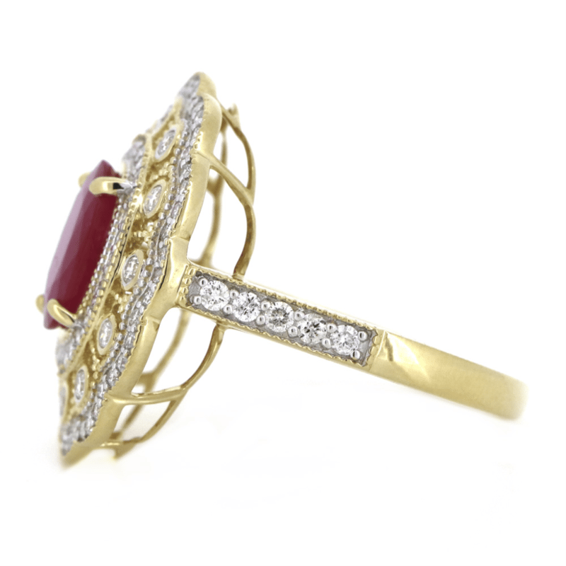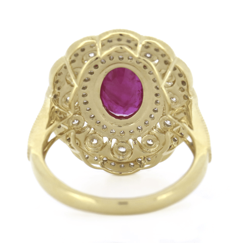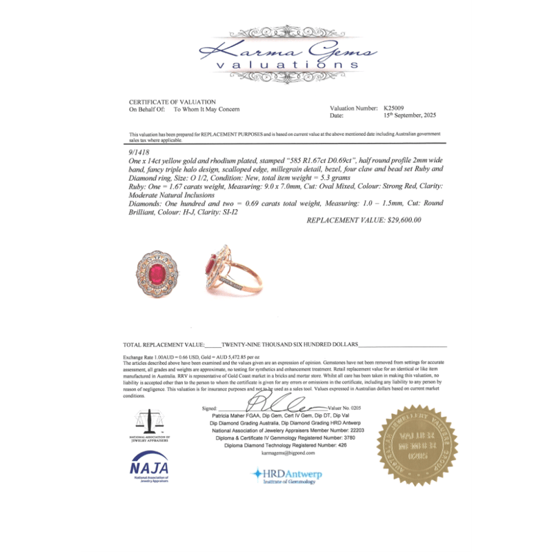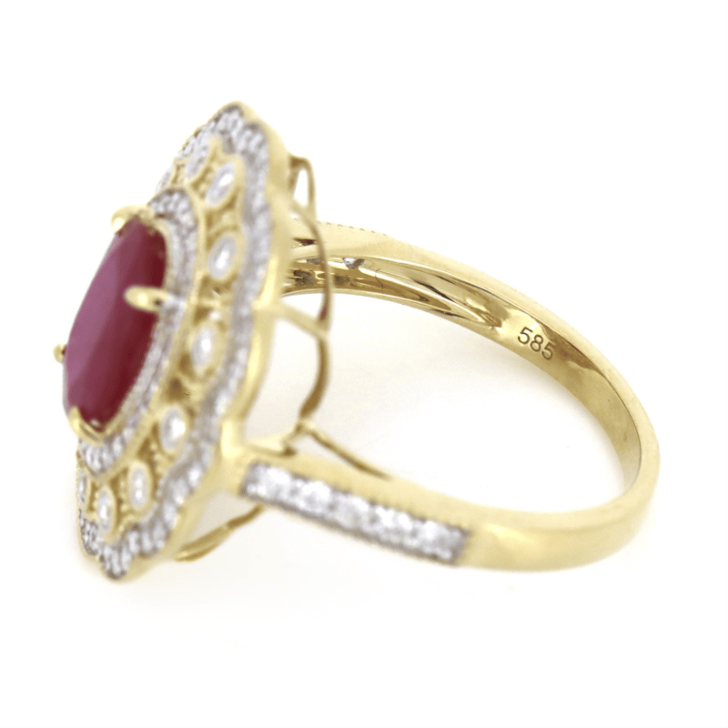 14K YELLOW GOLD, RUBY AND DIAMOND, DECORATIVE RING. THE CENTRE FEATURES, ONE OVAL CUT, STRONG RED, RUBY (1.67CT, MODERATE INCLUSIONS), 4 CLAW SET. SURROUNDING THE CENTRE AND DECORATING BAND ARE, 102 ROUND BRILLIANT CUT, DIAMONDS (0.69CT TDW, H-J COLOUR, SI-I2 CLARITY), BEZEL/BEAD SET IN YELLOW GOLD. RING SIZE O 1/2.