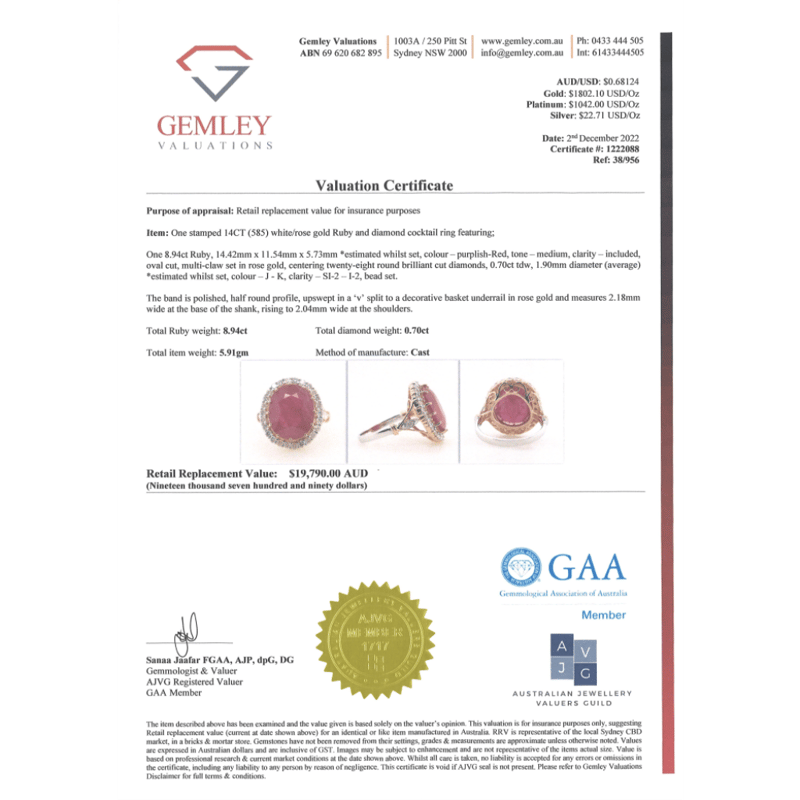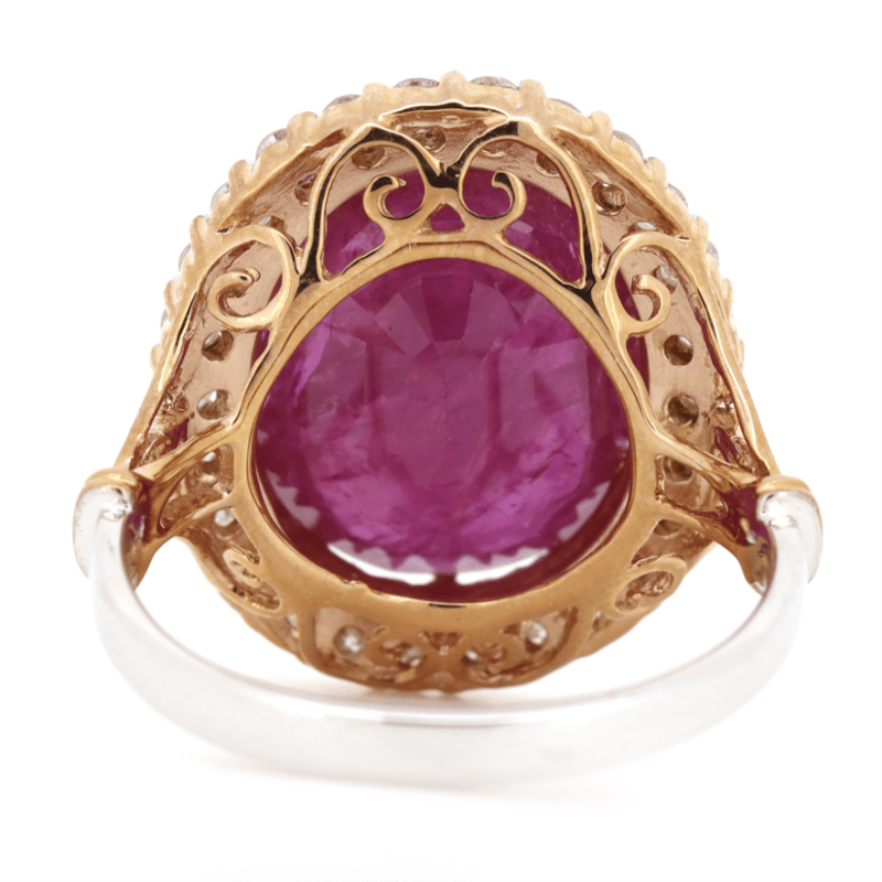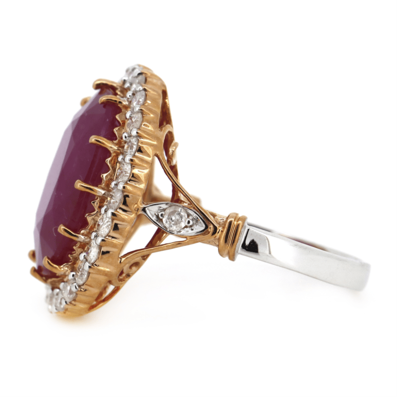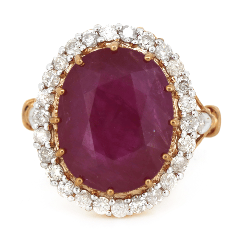 14K ROSE/WHITE GOLD, 8.94CT RUBY AND DIAMOND, STATEMENT RING. THE CENTRE FEATURES, ONE OVAL CUT, MEDIUM PURPLISH-RED, RUBY (8.94CT, INCLUDED), CLAW SET. SURROUNDING THE CENTRE AND DECORATING THE SHOULDERS ARE, 28 ROUND BRILLIANT CUT, DIAMONDS (0.70CT TDW, J-K COLOUR, SI2-I2 CLARITY), BEAD SET. RING SIZE N.