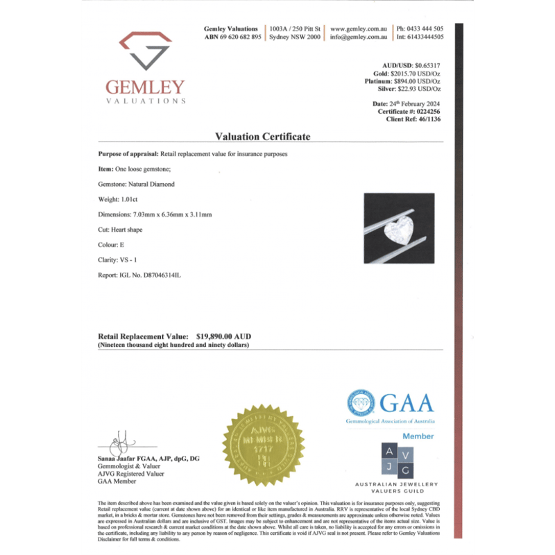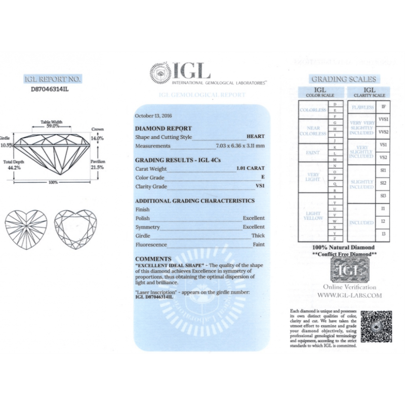 1.01CT CERTIFIED, NATURAL DIAMOND, HEART SHAPE CUT, E COLOUR, VS1 CLARITY, LOOSE, UNSET. STONE COMES WITH IGL REPORT: D87046314IL.