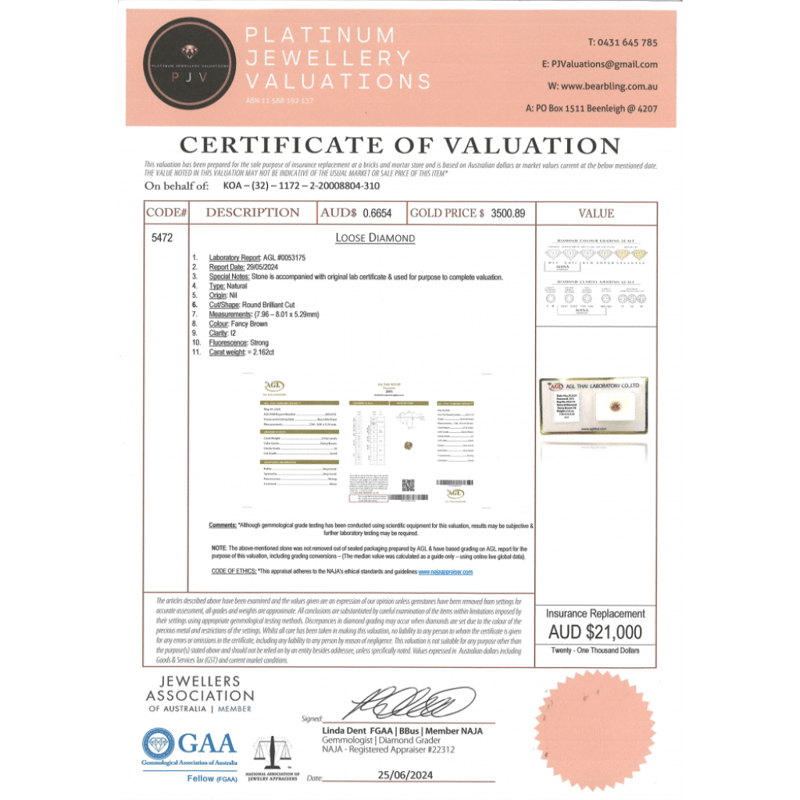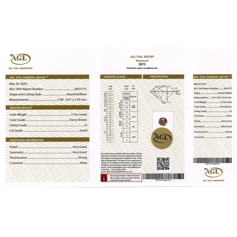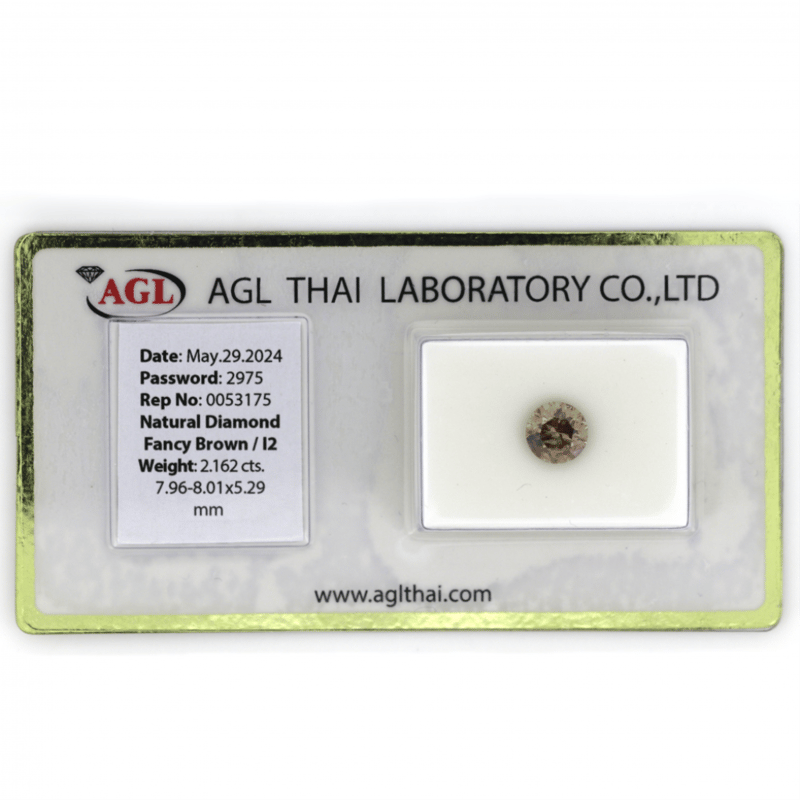2.162CT CERTIFIED, NATURAL FANCY BROWN DIAMOND, ROUND BRILLIANT CUT, FANCY BROWN, I2 CLARITY, LOOSE, UNSET. STONE COMES SEALED WITH AGL REPORT: 0053175.