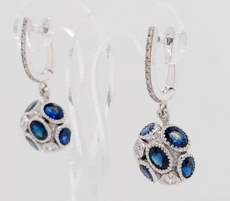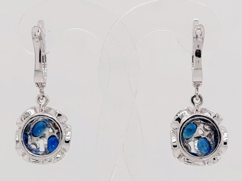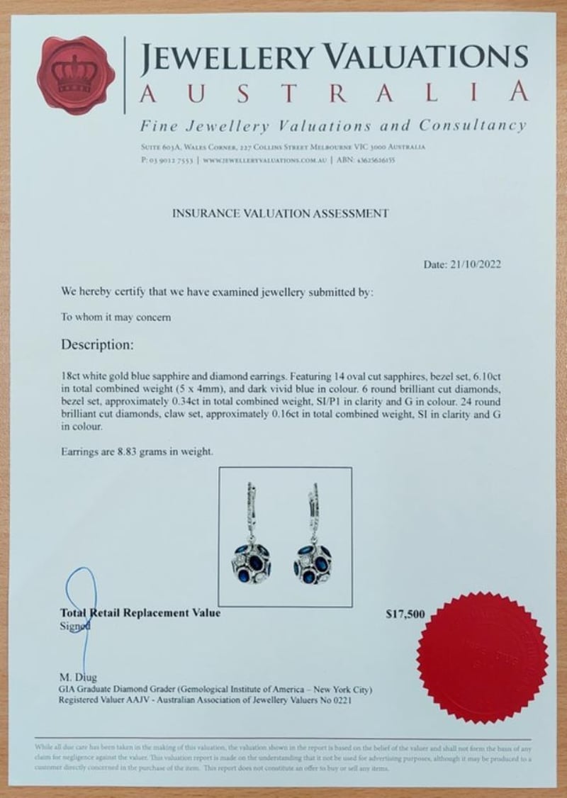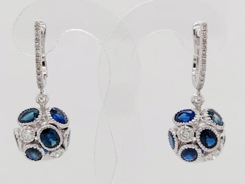 These 18Ct White Gold Drop Earrings Feature 14 X Oval Cut Bezel Set Sapphires, 6.10Ct In Total Combined Weight, 5Mm X 4Mm And Dark Vivid Blue In Colour With 6 X Round Brilliant Cut Bezel Set Diamonds, 0.34Ct In Total Combined Weight, Si/P1 In Clarity And G In Colour And 24 X Round Brilliant Cut Claw Set Diamonds, Approx. 0.16Ct In Total Combined Weight, Si In Clarity And G In Colour.