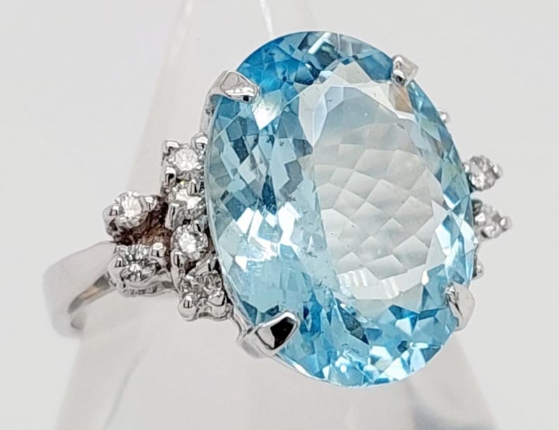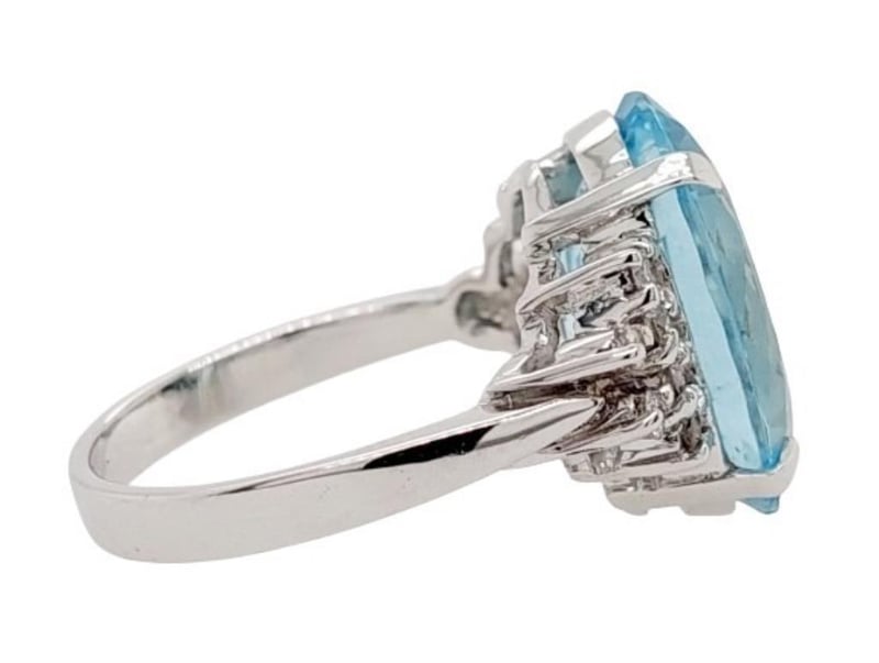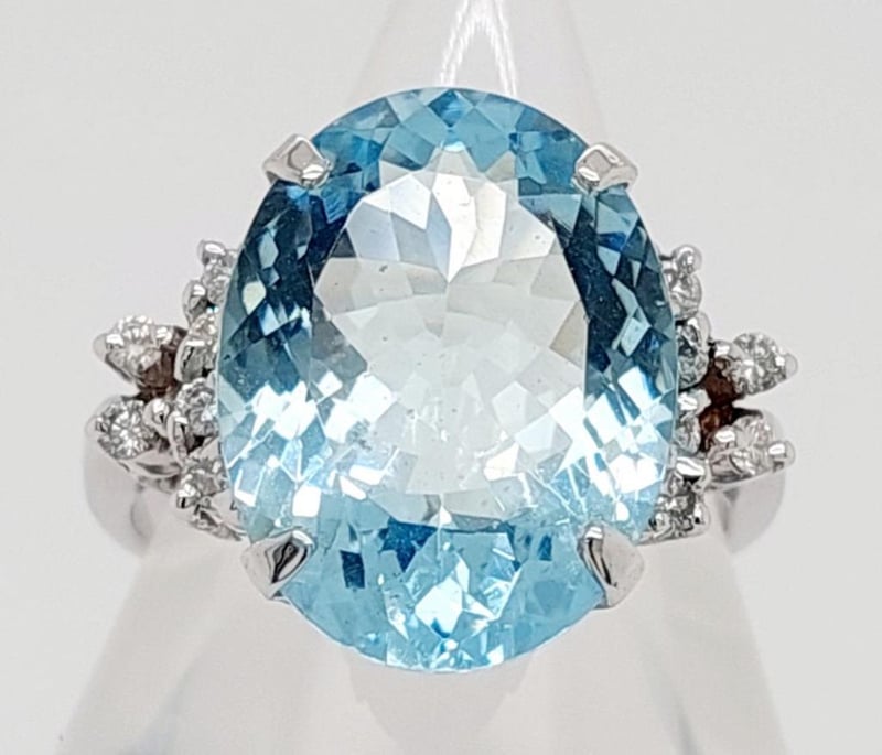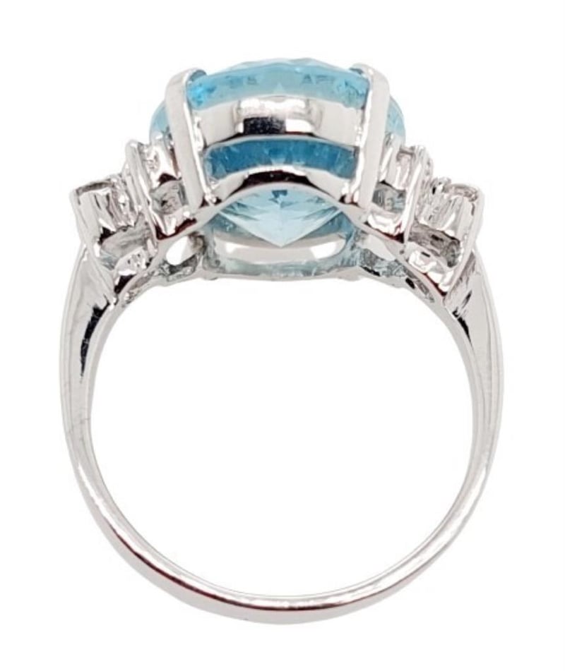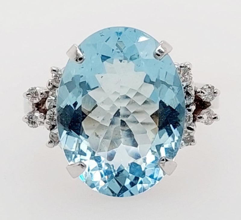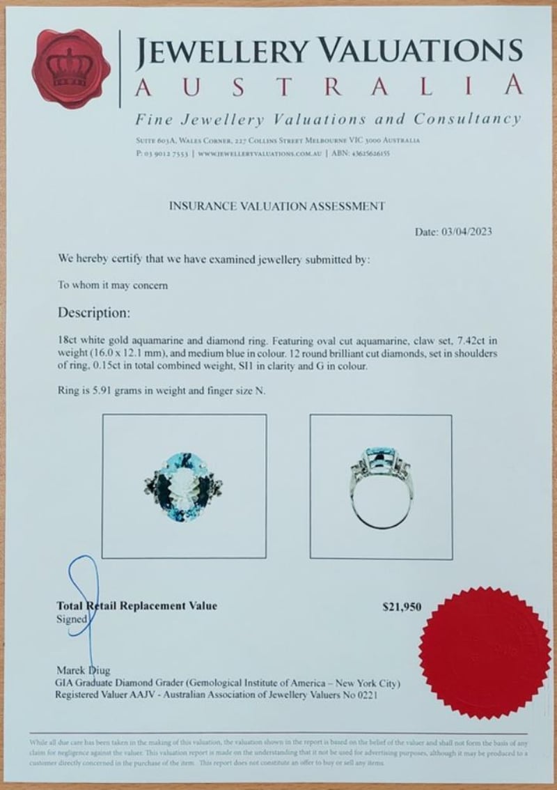 18CT WHITE GOLD AQUAMARINE AND DIAMOND RING Total Item Weight: 5.91gms This 18Ct White Gold Ring Features 1 X 7.42Ct Oval Cut Claw Set Aquamarine Measuring 16.0Mm X 12.1Mm And Medium Blue In Colour With 12 X Round Brilliant Cut Diamonds Set In The Shoulders Of The Ring, 0.15Ct In Total Combined Weight, Si1 In Clarity And G In Colour.Ring Size: N Jewellery Valuations Provided By A Third Party Professional Not Directly Associated With Lloyds Auctions at AUD $21950This Insurance Valuation has been provided by a registered Jewellery Valuer and is intended for insurance purposes only. The valuation amount has no bearing on the auction value of the item. Any questions regarding the valuation should be directed to the issuing Valuer (refer to contact details on the certificate) as Lloyds have no association or relationship with the Valuer or the valuation amount contained within the valuation. Condition: Excellent- Refer Images 0162901+62CROSSDOCK