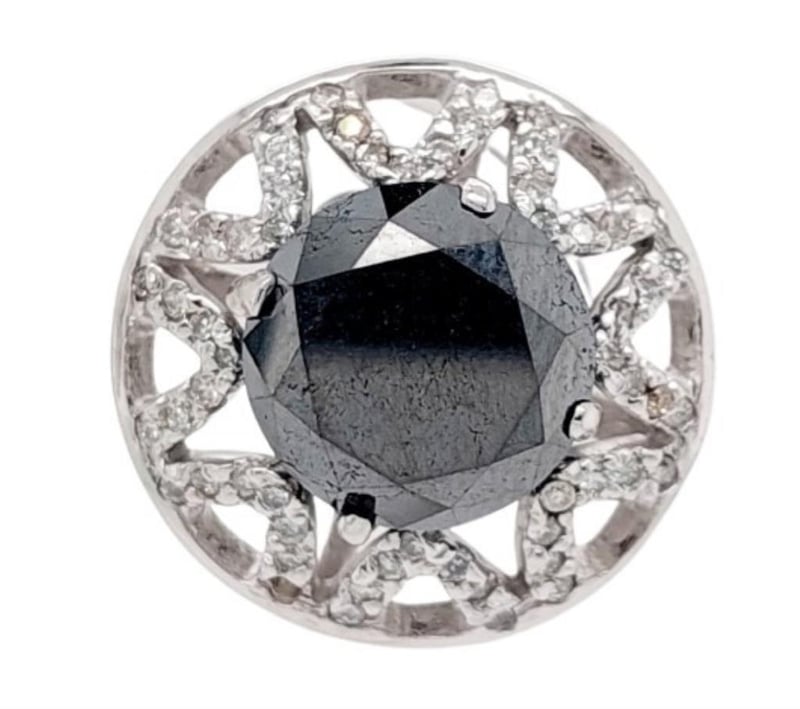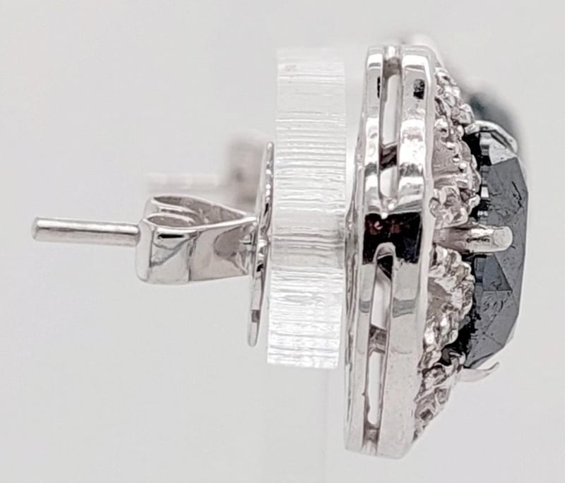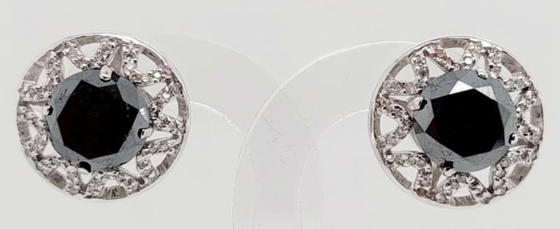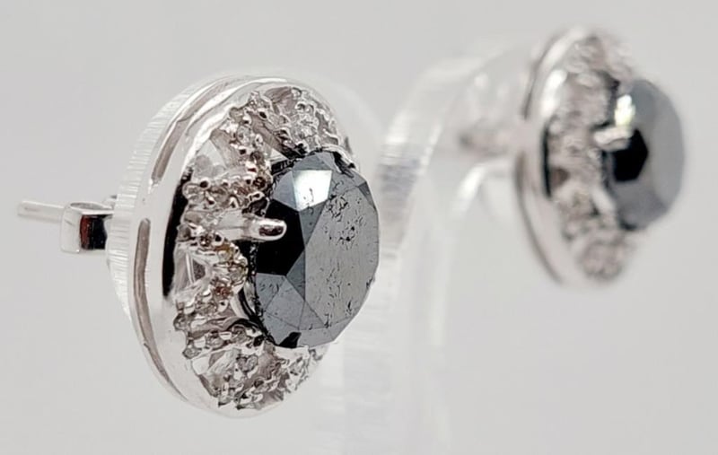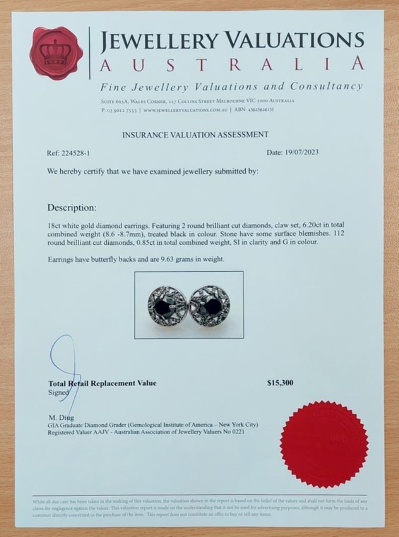 These 18Ct White Gold Earrings With Butterfly Backs Feature 2 X Round Brilliant Cut Claw Set Diamonds, 6.20Ct In Total Combined Weight, Measuring 8.6Mm - 8.7Mm And Treated Black In Colour With Some Surface Blemishes. These Earrings Also Feature 112 Round Brilliant Cut Diamonds, 0.85Ct In Total Combined Weight, Si In Clarity And G In Colour.
