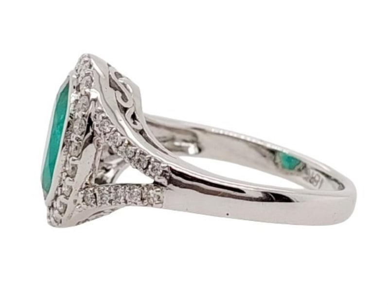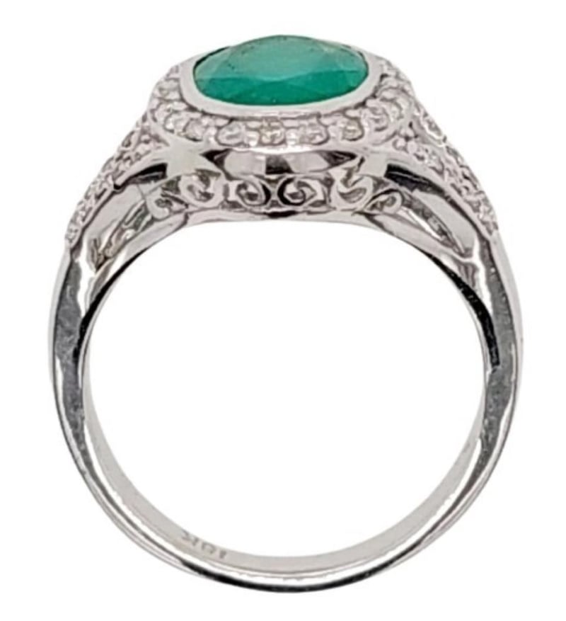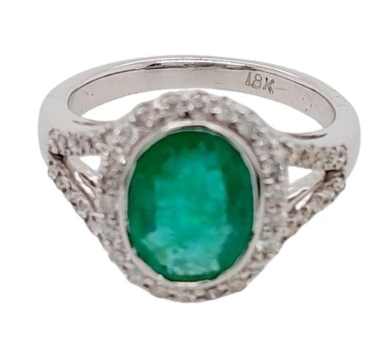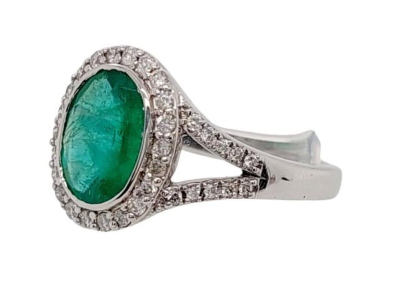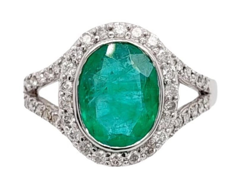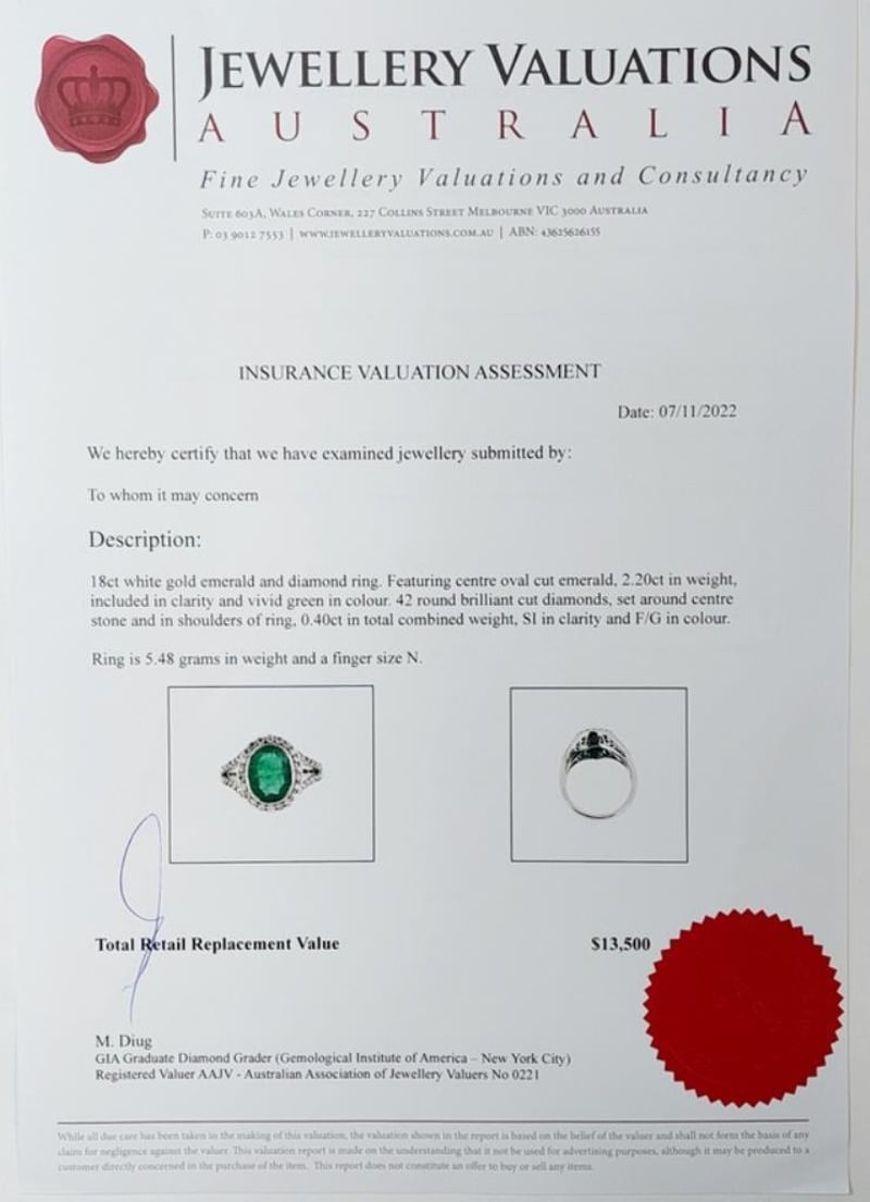 This 18Ct White Gold Ring Features 1 X 2.20Ct Oval Cut Emerald, Included In Clarity And Vivid Green In Colour With 42 Round Brilliant Cut Diamonds Set Around The Centre Stone And In The Shoulders Of The Ring, 0.40Ct In Total Combined Weight, Si In Clarity And F-G In Colour.