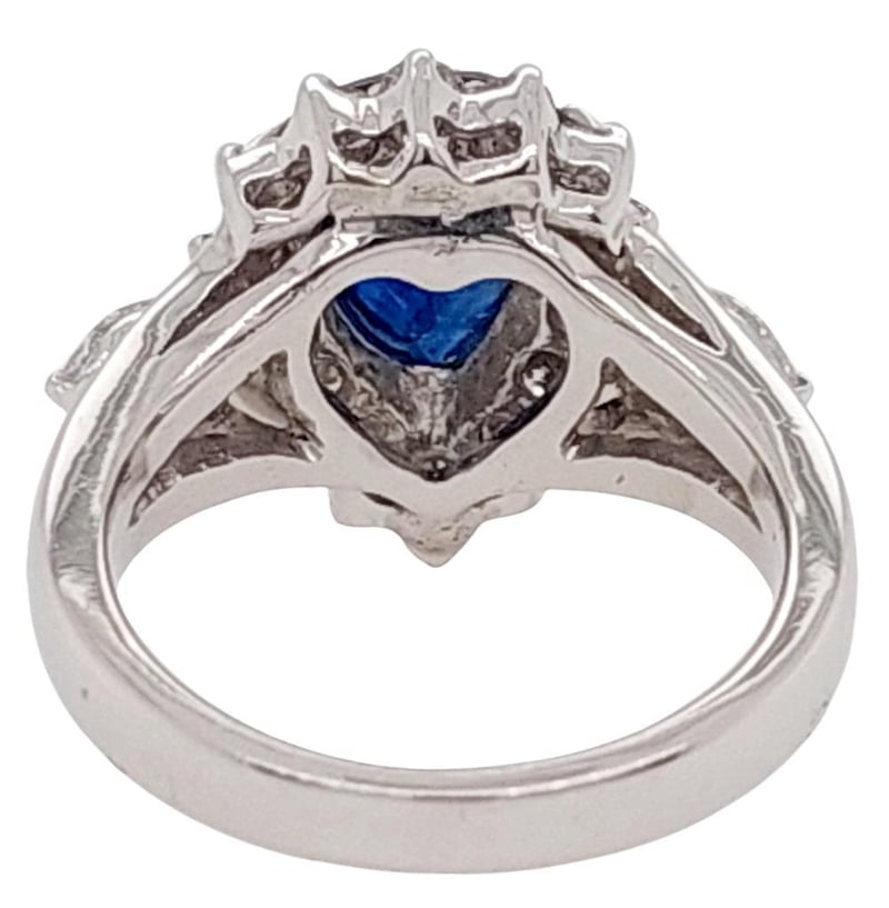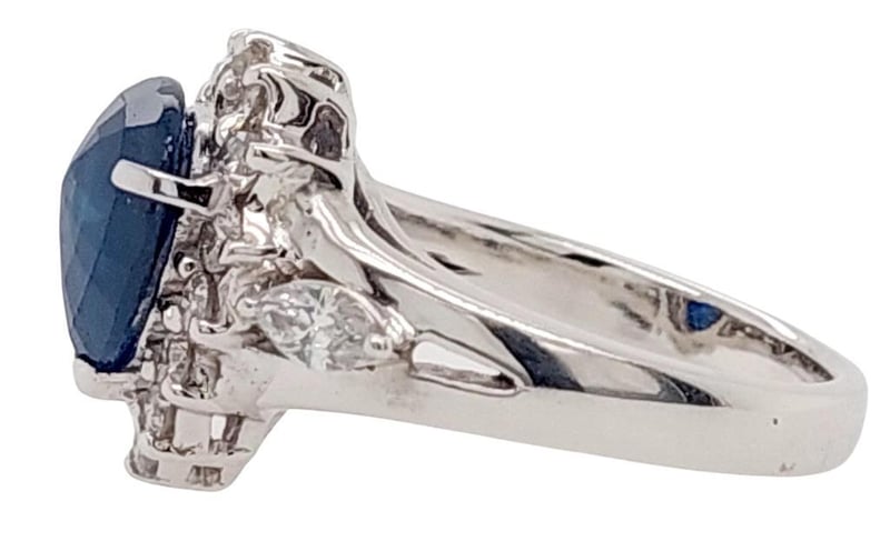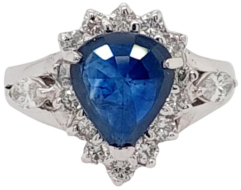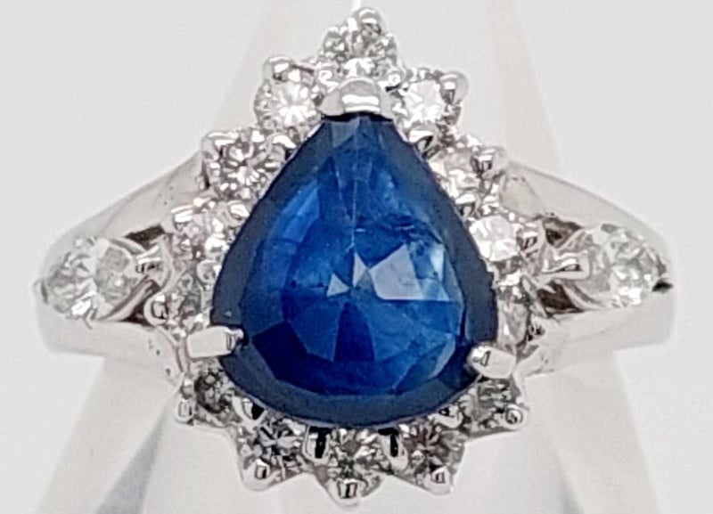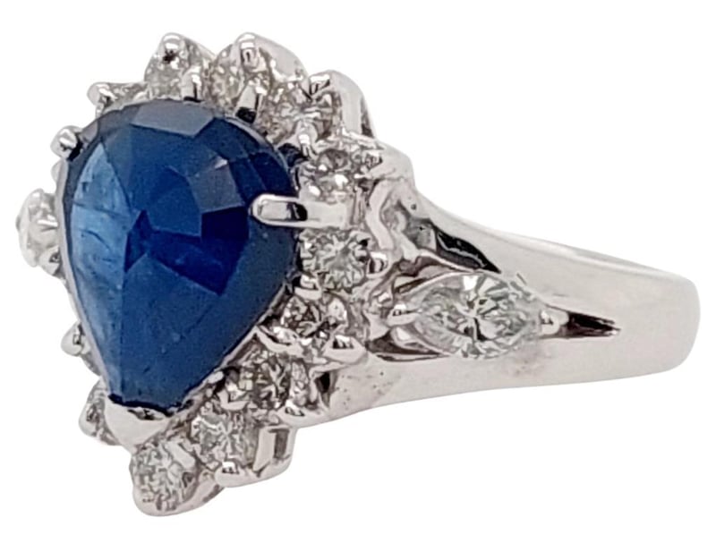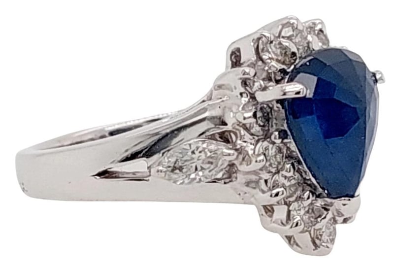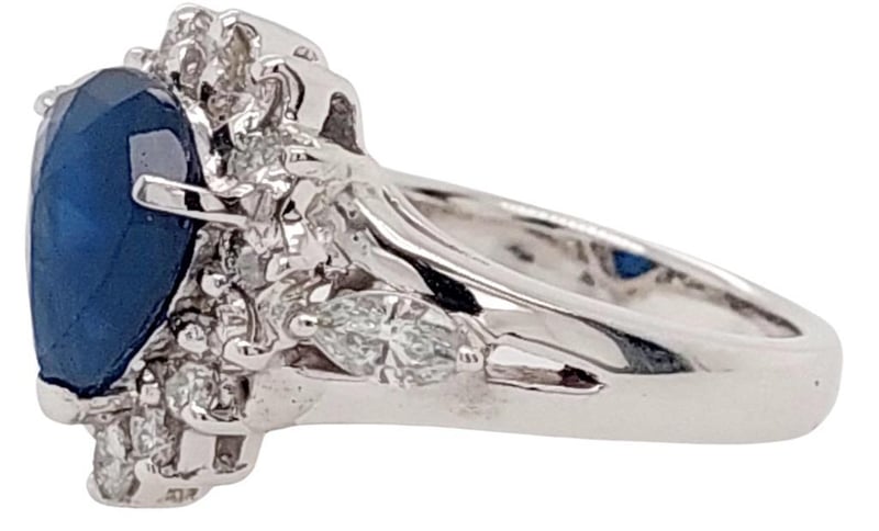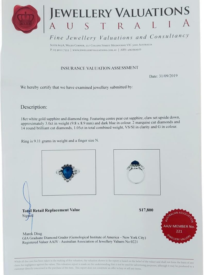 This 18Ct White Gold Ring Features One (1) X Claw Set Pear Cut Sapphire, Approx. 3.0Ct, Measuring 9.8Mm X 8.9Mm And Dark Blue In Colour With Two (2) X Marquise Cut And 14 Round Brilliant Cut Diamonds, 1.05Ct In Combined Weight, Vs-Si In Clarity And G In Colour.