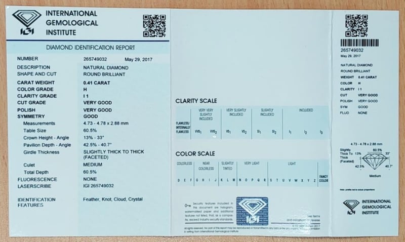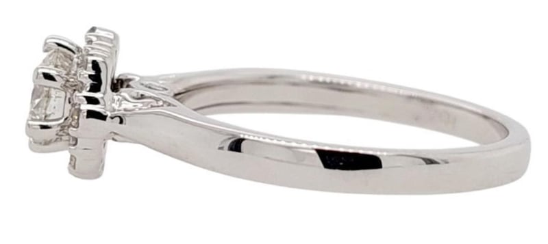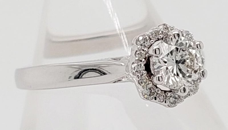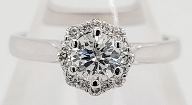18CT WHITE GOLD DIAMOND RING This White Gold Ring Features 1 X 0.41Ct Round Brilliant Cut Diamond Measuring 4.73Mm X 4.78Mm X 2.88Mm, H In Colour And I1 In Clarity As Per Igi Report Number 265749032. The Main Stone Is Surrounded By Round Brilliant Cut Diamonds. Condition: Excellent- Refer Images 0162901+70CROSSDOCK