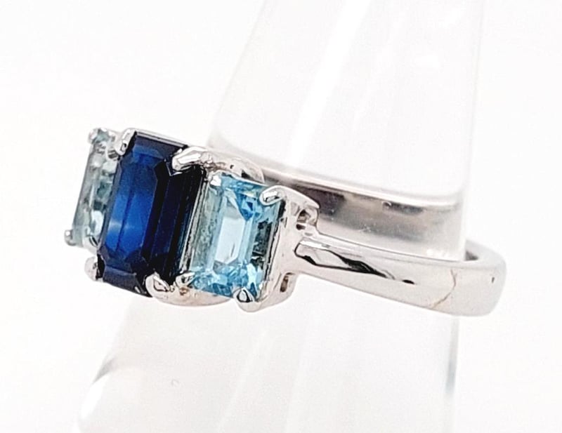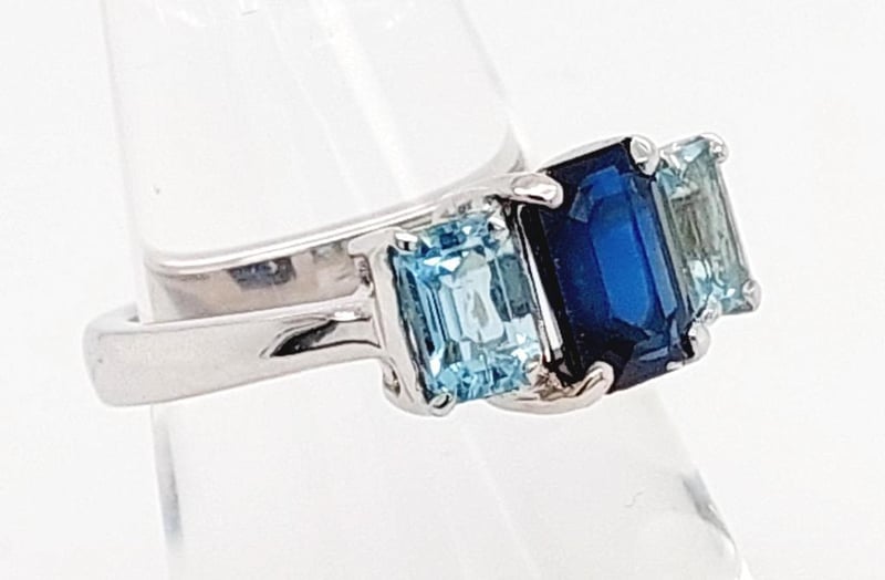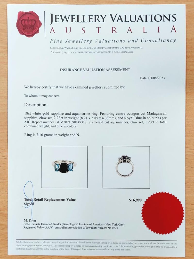 This 18Ct White Ring Features One 2.23Ct Octagon Cut Claw Set Madagascan Sapphire Measuring 8.21Mm X 5.85Mm X 4.33Mm And Is Royal Blue In Colour With 2 Emerald Cut Claw Set Aquamarines,1.20Ct In Total Combined Weight And Blue In Colour.