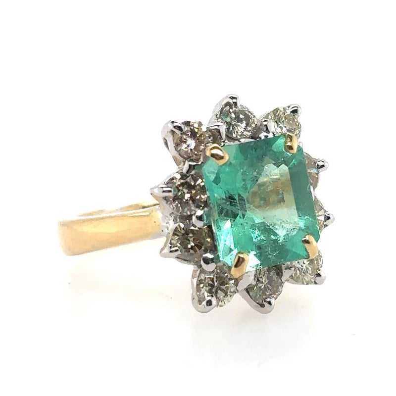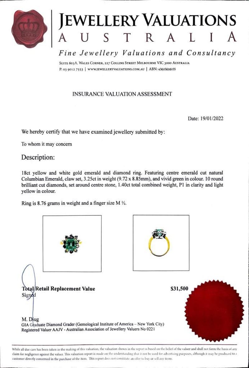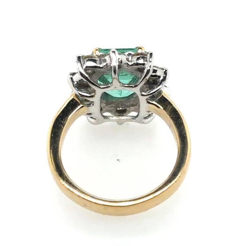 This 18Ct Yellow And White Gold Ring Features 1 X 3.25Ct Emerald Cut Claw Set Columbian Emerald, Measuring 9.72Mm X 8.85Mm And Is Vivid Green In Colour. This Ring Also Features 10 X Round Brilliant Cut Claw Set Diamonds Set Around The Centre Stone, 1.40Ct In Total Combined Weight, P1 In Clarity And Light Yellow In Colour. Ring Size: M 1/2.