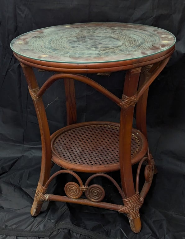 ROUND WICKER GLASS TOP TABLE Item Size: Height: 60cm, Width: 40cm, Depth: 40cm Note: Glass Is Unattached But Included Condition: Good - Refer To Images 584940+5