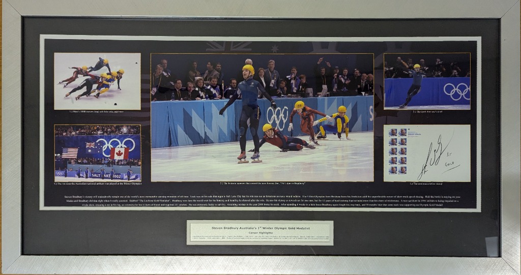 2002 AUSTRALIAN WINTER OLYMPIC GOLD MEDALIST STEVEN BRADBURY FRAMED AND SIGNED Item Size: Height: 38cm, Width: 88cm, Depth: 4cm Includes Signature From Steven Bradbury, Commemorative Stamp, And Highlights. Condition: Good - Refer To Images 584940+7