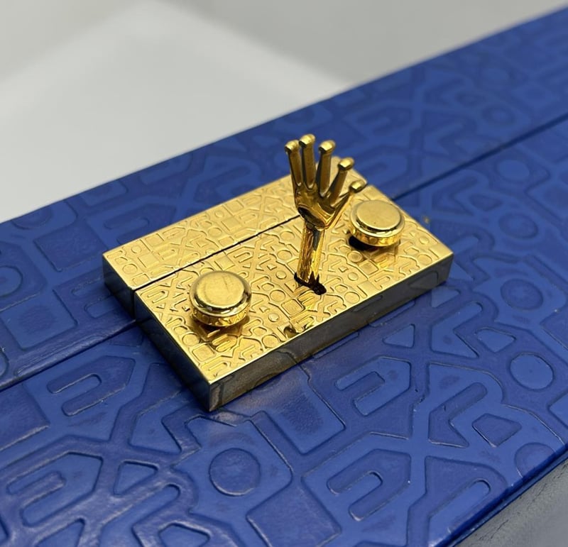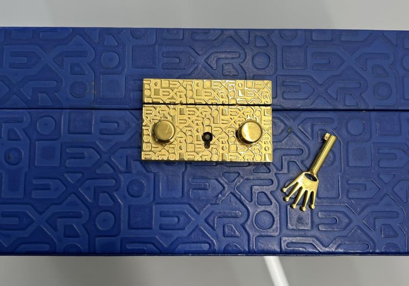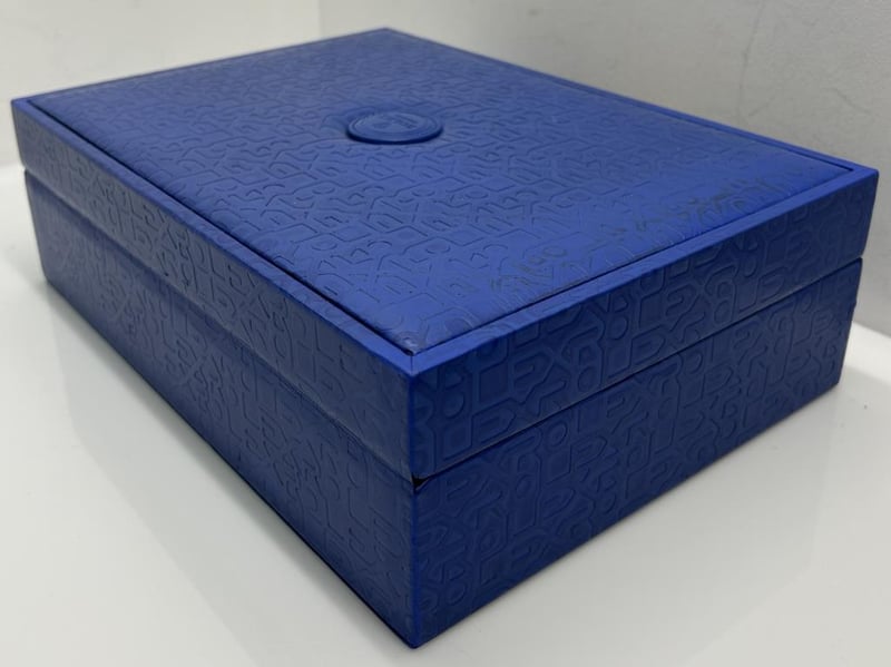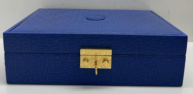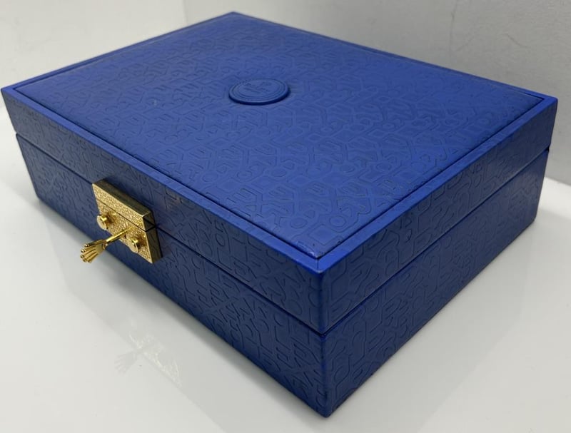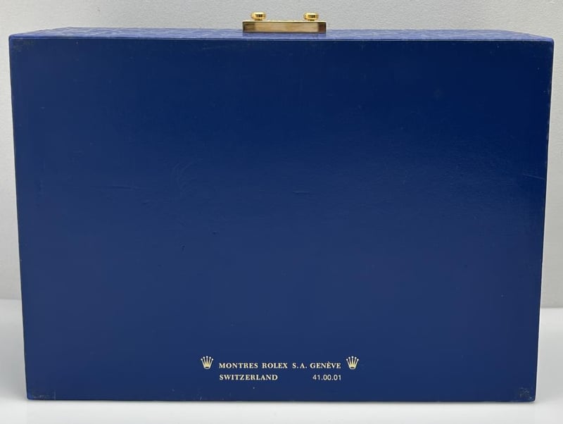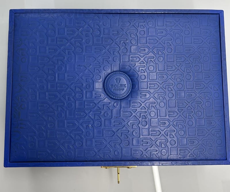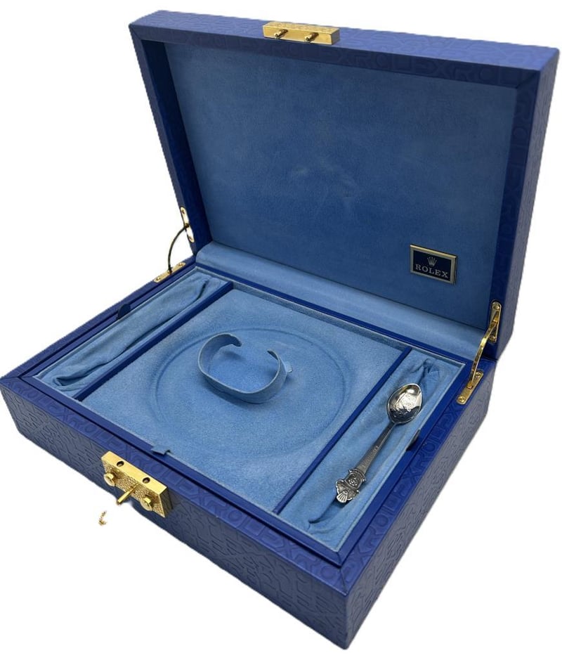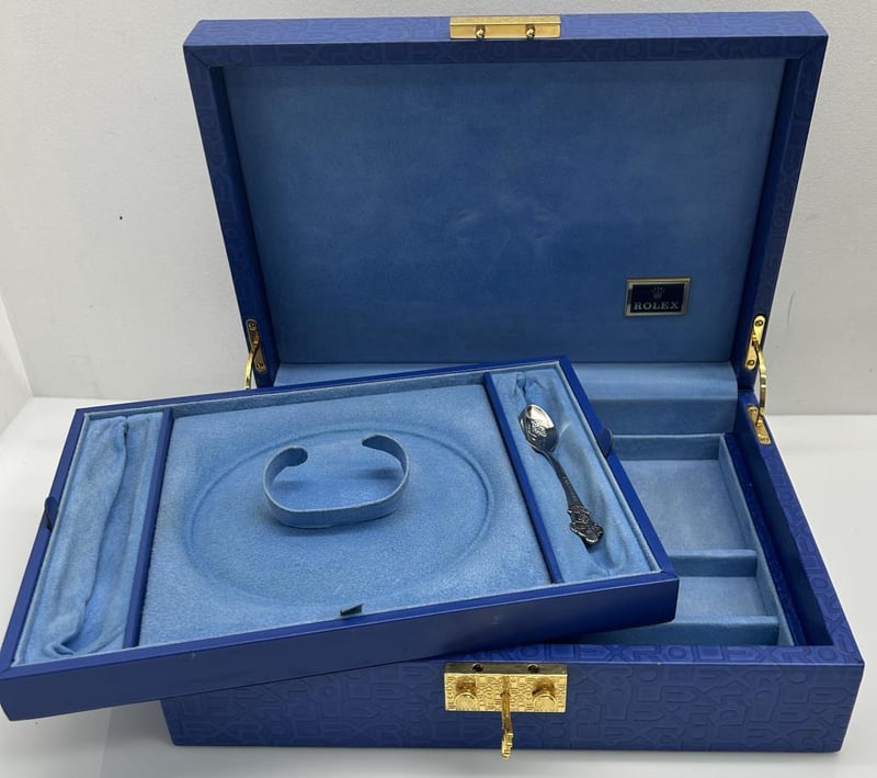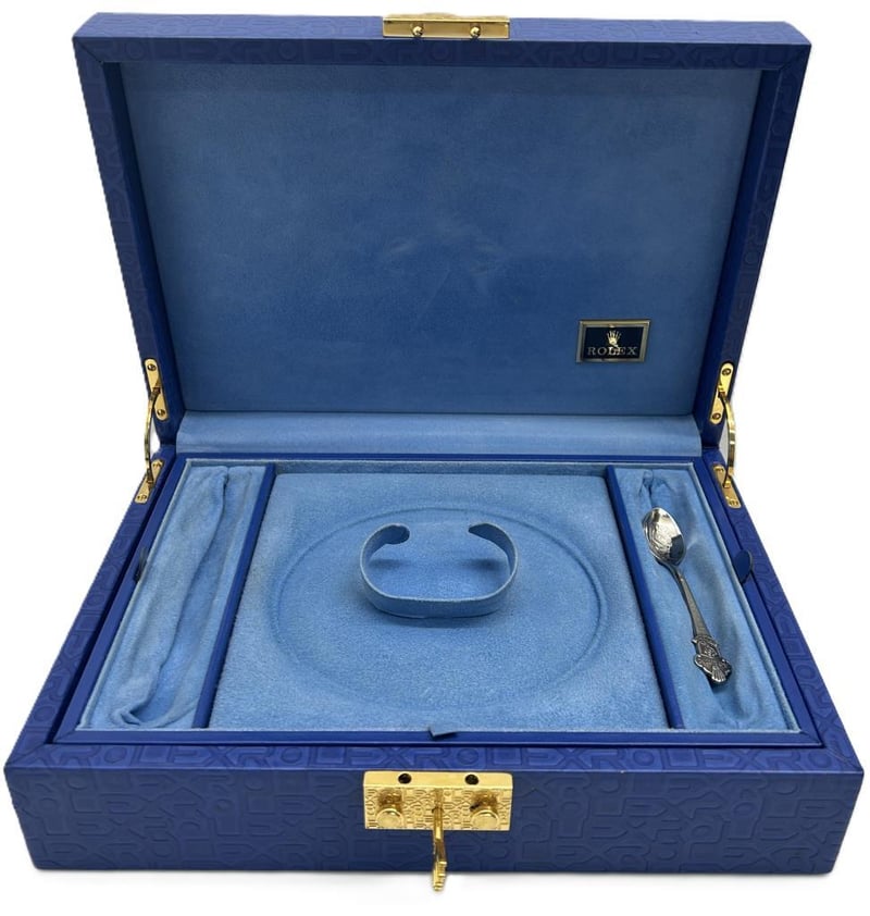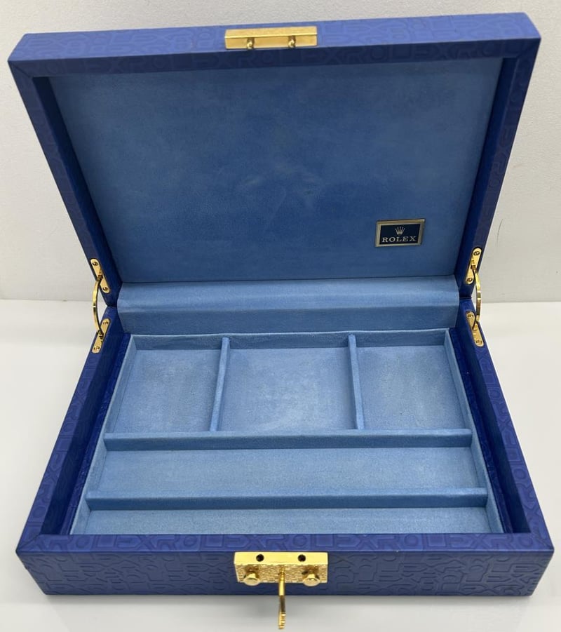 ROLEX PRESENTATION JEWELLERY & WATCH BOX, A RARE AND LUXURIOUS ROLEX JEWELLERY BOX CRAFTED IN DEEP ROYAL BLUE, EMBOSSED WITH THE ICONIC ROLEX MONOGRAM PATTERN AND CROWN EMBLEM ON THE LID. FEATURES A GOLD-TONE LOCK, HINGES, AND MATCHING KEY, SHOWCASING EXCEPTIONAL CRAFTSMANSHIP. THE INTERIOR IS LINED WITH PLUSH BLUE SUEDE AND INCLUDES COMPARTMENTS FOR A WATCH, JEWELLERY, AND ACCESSORIES, ALONG WITH A SILVER ROLEX SPOON. FINISHED WITH AN OFFICIAL ROLEX GENEVA PLAQUE, THIS ELEGANT COLLECTOR’S PIECE EMBODIES TIMELESS PRESTIGE AND SOPHISTICATION, MEASURES 29 × 21 × 9CM.