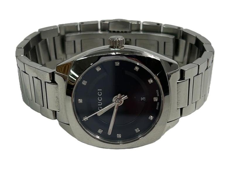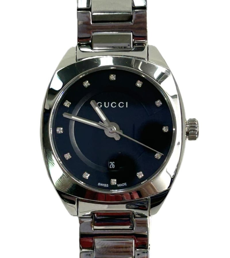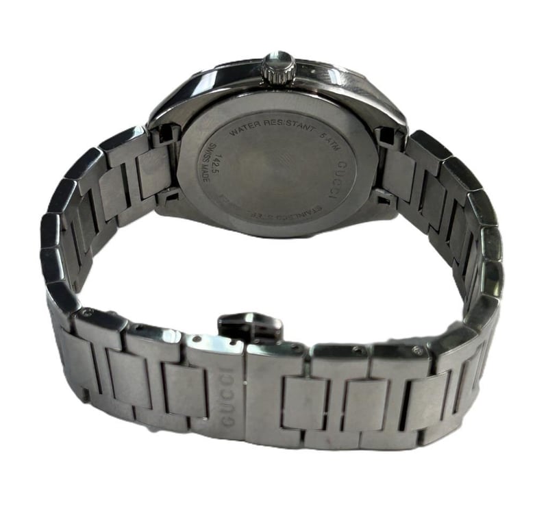 GUCCI G-TIMELESS DIAMOND WATCH, MODEL 142.5, BLACK DIAL WITH DIAMOND HOUR MARKERS, DATE DISPLAY, CASE MEASURES 28MM, WR 5 ATM, SWISS MADE, QUARTZ MOVEMENT, STAINLESS STEEL BRACELET WITH DOUBLE DEPLOYMENT CLASP. Condition: Good - Refer To Images