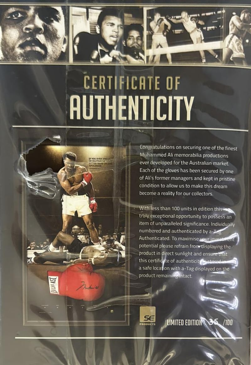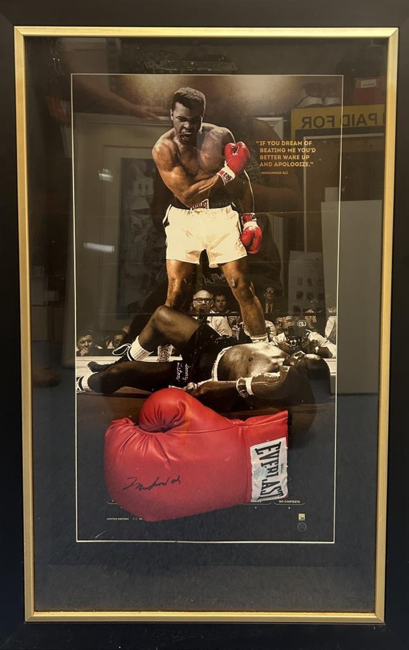 MUHAMMAD ALI SIGNED BOXING GLOVE DISPLAY, ICONIC “SONNY LISTON KNOCKOUT” PHOTOGRAPH WITH QUOTE, FRAMED IN SHADOW BOX, MEASURES 64 X 99 X 12.5CM. THIS ITEM HAS BEEN PROFESSIONALLY VERIFIED AS A GENUINE PRODUCT AND COMES WITH ACCOMPANYING 3RD PARTY CERTIFICATE OF AUTHENTICITY