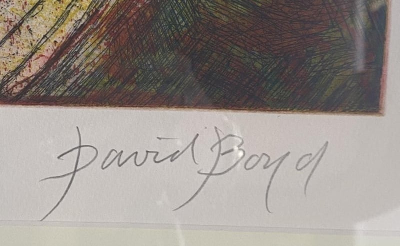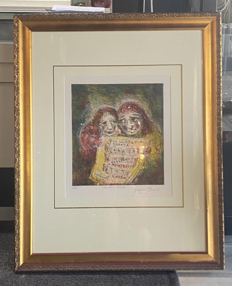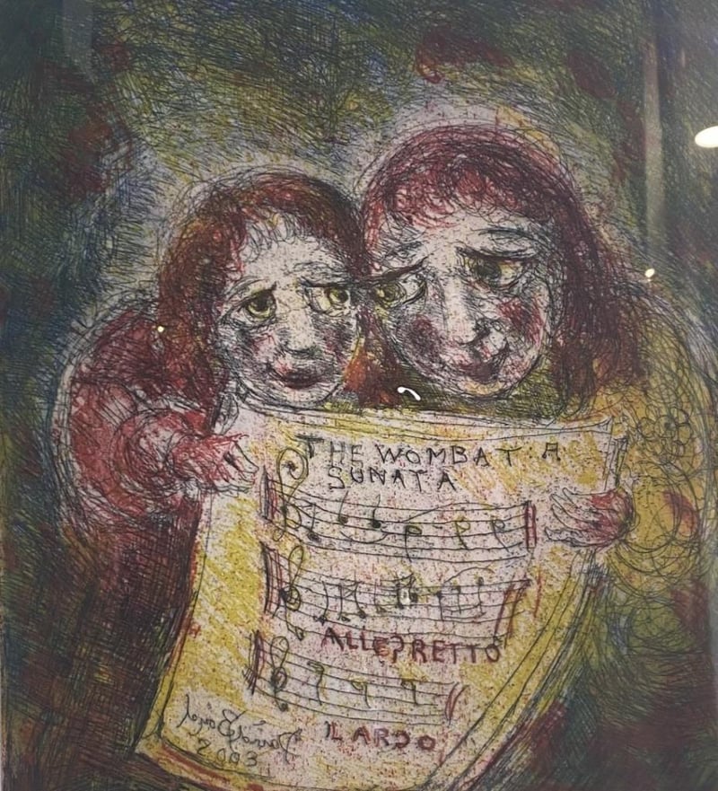 DAVID BOYD ‘WOMBAT SONATA’ ETCHING, ARTIST – DAVID BOYD, TITLE – WOMBAT SONATA, MEDIAN  – ETCHING ON PAPER, GOLD WOODEN FRAME, MEASURES 73 X 90CM INCLUDING FRAME, EDITION 26/60, SIGNED BOTTOM RIGHT.